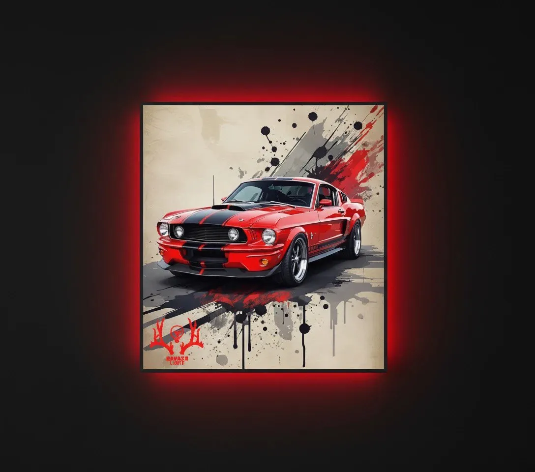 این تابلو بکلایت نمایی جذاب و پرقدرت از یک خودرو کلاسیک قرمز را در فضایی هنری و اسپرت به تصویر میکشد. پسزمینهی اثر با ترکیبی از پاشش رنگ سیاه و قرمز، حس انفجار انرژی و هیجان را به مرکز تصویر هدایت میکند. زاویه دید از روبهرو و کمی مورب انتخاب شده تا تناسب بدنه، حجم گلگیرها و خطوط مسابقهای مشکی روی کاپوت بیشترین جلوه را داشته باشند. این اثر تلفیقی از سبک واقعگرایی و طراحی اسپریگرافی (Splash Art) است که ترکیب حرکت، قدرت و بیان هنری را در کنار هم ارائه میدهد. چاپ تصویر بر روی **تختهشاسی ۸ میلیمتری** انجام شده و نور **قرمز آتشین** از **نوارهای ۱۲ ولت** در پشت تابلو تابیده میشود؛ نوری که هماهنگ با رنگ بدنه و لکههای پسزمینه است و فضای داغ، جسور و شورانگیزی پیرامون قاب ایجاد میکند، گویی خودرو از دل انفجار رنگ طلوع کرده است.
