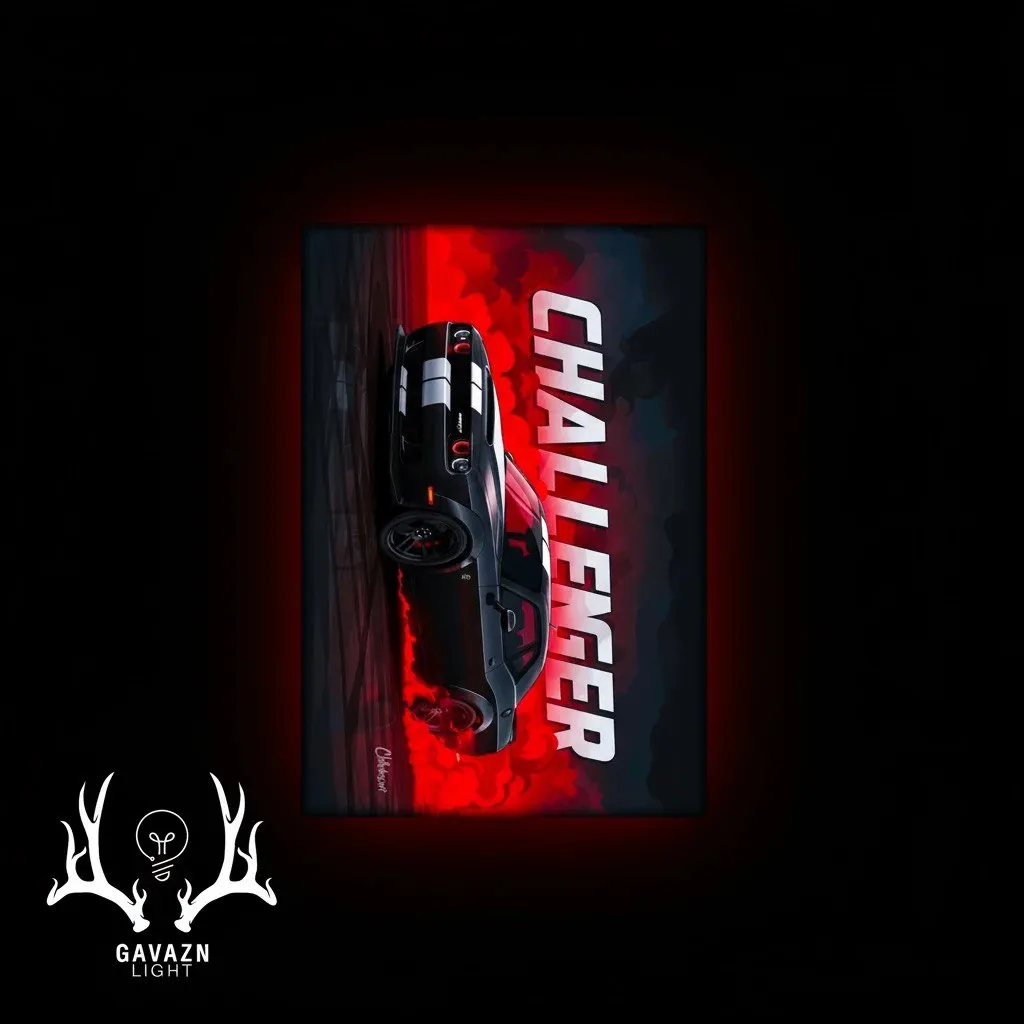 این تابلو بکلایت تصویری تهاجمی از **Dodge Challenger** را در حال اوجگیری میان دود و شعلههای قرمز به نمایش میگذارد؛ نمادی از قدرت خام و صدای بم موتور آمریکایی که در رگهای جاده میغرد. تناسب خطوط منحنی بدنه با پسزمینه شعلهفام، حس حرکت بیوقفه را ایجاد کرده و نوشته بزرگ **CHALLENGER** در کنار آن همچون فریادی از جنس هیجان و بیپروایی است. نورپردازی قرمز تند در پسزمینه، انرژی خشمگین خودرو را برجسته میکند و تضاد میان سیاهی و سرخی، جلوهای از نبرد میان کنترل و جنون را در ذهن بیننده زنده میسازد. این اثر بر روی **تختهشاسی ۸ میلیمتری** چاپ شده و با **نوارهای ۱۲ ولت** مجهز به نور **قرمز آتشین** از پشت، هالهای داغ و زنده پدید میآورد که خودرو را در قلب شعله روشن نگاه میدارد؛ تصویری از تسلط، سرعت و عصیان انتخابشده برای روحی ناآرام.