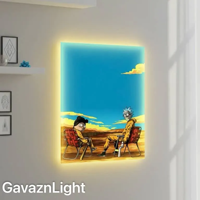تابلو بک‌لایت طرح ریک ومورتی 2 یک ترکیب خلاقانه و کراس‌اوور جذاب بین دنیای طنز علمی‌–تخیلی **ریک و مورتی** و فضای تیره و پرتنش سریال **Breaking Bad** را نمایش می‌دهد. در تصویر، ریک و مورتی با لباس‌های زرد آزمایشگاهی مشهور والتر و جسـی، روی صندلی‌های تاکردنی فلزی در وسط بیابان خشک نیومکزیکو نشسته‌اند. ریک با بطری نوشیدنی در دست، نگاهی بی‌تفاوت به دوردست دارد و مورتی با حالت متفکرانه به سمت بیننده نگاه می‌کند. آسمان آبی شفاف با ته‌رنگ‌های زرد گرم، حس غروب و گرمای بیابان را منتقل می‌کند. چاپ این اثر با وضوح بالا روی **تخته‌شاسی فشرده ۸ میلی‌متری** انجام شده و نور پس‌زمینه‌ی **LED ۱۲ ولت طلایی گرم (Golden Warm Light)** به تابلو درخشش خاصی داده است؛ نوری که با تم زرد لباس‌ها و رنگ زرد افق بیابان به‌طور کامل هم‌خوانی دارد و حس گرمای صحنه را دوچندان می‌کند. **مشخصات فنی و هنری:** – چاپ: وضوح بالا بر روی **تخته‌شاسی ۸ میلی‌متری** – نور: **LED ۱۲ ولت Golden Warm Light** – سبک: **Cartoon Crossover / Pop Art Drama** – پالت رنگی: زرد، قهوه‌ای خاکی، آبی آسمانی، سفید – حس کلی: طنز تلخ، ماجراجویی و درام جنایی در قالب هنری این تابلو با ترکیب دو جهان متفاوت، انتخابی خاص برای دیوار اتاق‌های مدرن، استودیوهای هنری یا مجموعه‌داران علاقه‌مند به آثار تلفیقی و کراس‌اوور است. اگر بخواهی الان می‌توانم این دو اثر جدید Rick & Morty (پرواز کاغذی و کراس‌اوور Breaking Bad) را به جدول به‌روزرسانی‌شده‌ات اضافه کنم تا فهرست کامل شود.