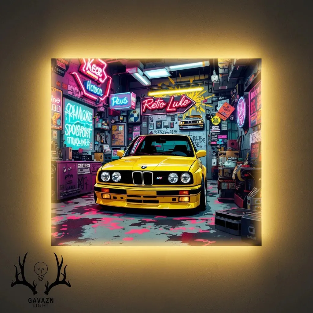 این تابلو بکلایت صحنهای نوستالژیک و پرانرژی از یک **BMW M3 کلاسیک (E30)** را در گاراژی پوشیده از نئونهای رنگارنگ نمایش میدهد؛ خودروی زرد درخشان در مرکز تصویر، با خطوط هندسی تند و نگاه مصمم چراغها، حس اصالت دههی ۸۰ میلادی را زنده کرده است. دیوارهای گاراژ با تابلوهای نئونی بنفش، فیروزهای و صورتی پوشیده شدهاند که بر شور و تنوع فرهنگی تیونینگ اروپایی تأکید دارند. زمین آلوده به رنگ و روغن، همراه با سایههای براق بدنه خودرو، حس کارگاه واقعی و عطر بنزین را تداعی میکند. این اثر روی **تختهشاسی ۸ میلیمتری** چاپ شده و با نور **طلایی گرم** حاصل از **نوارهای ۱۲ ولت** از پشت تابلو، حالتی زنده و صمیمی یافته که گویی نور نئونهای اطراف به روی بامو بازتاب مییابد؛ تلفیقی از کلاسیک، فرهنگ خیابانی و هنر نورپردازی معاصر.