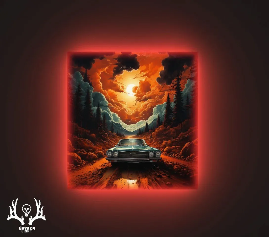 این تابلو بک‌لایت تصویری چشم‌نواز از **Chevrolet Impala کلاسیک** را در جاده‌ای کوهستانی و پوشیده از خاک سرخ نشان می‌دهد؛ خودرو در مرکز صحنه با رنگ سبز تیره و انعکاس نور خورشید بر سطح کاپوت، سرمای فلز را در دل منظره‌ای از گرما و شعله به نمایش گذاشته است. ابرهای ضخیم آتشگون در آسمان پیچیده‌اند و خورشید نیمه‌پنهان میان آن‌ها، با تابش نارنجی درخشان خود، تضاد تند و پرانرژی میان نور و تاریکی را شکل داده است. تنه‌های بلند درختان جنگلی در عمق تصویر با رنگ‌های تیره و سبز آبی مکمل آسمان شعله‌ور، عمق نمایشی اثر را افزایش می‌دهند. چاپ اثر بر روی **تخته‌شاسی ۸ میلی‌متری** صورت گرفته و با **نوارهای ۱۲ ولت** مجهز به نور **قرمز آتشین** روشن شده تا شعله‌های مجازی پرحرارت اطراف کادر را احاطه کنند و حس تقابل میان سکون ماشین و خشم طبیعت را زنده سازند؛ نمایشی از اقتدار کلاسیک و زیبایی بی‌زمان در میان جاده‌ای غرق در آتش و سکوت.