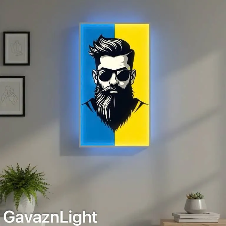 فرم گرافیکی مو و ریش با خطوط ضخیم و سایههای نرم در مرز میان دو رنگ قرار گرفته و عمق آن به لطف بکلایت سرد بیشتر دیده میشود این همان ترکیب کلاسیک مینیمال دو رنگ است که برای فضاهای مدرن مردانه به شدت محبوب است و با نور آبی یخی حالت تکنیکال و خنک در اتاق ایجاد میکند