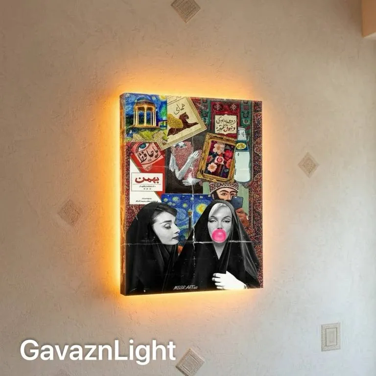 این تابلو بک‌لایت تصویری سرشار از جزئیات فرهنگی و نشانه‌های نوستالژیک ایرانی را در قالب یک کلاژ پرانرژی و رنگارنگ ارائه می‌دهد؛ ترکیبی که از تکه‌پوسترها، بسته‌بندی‌های قدیمی، عکس‌های چاپی، نقش‌های فرش و رگه‌هایی از طراحی سنتی الهام گرفته و همه عناصر را در یک ساختار لایه‌لایه و زنده کنار هم قرار داده است. حضور رنگ‌های متنوع از قرمزهای پرحرارت تا سبزهای سنتی و آبی‌های ایرانی، به همراه بافت‌های کاغذی فرسوده و خطوطی که عمداً حالت پوسترهای قدیمی کوچه و بازار را تداعی می‌کنند، فضایی آشنا و نوستالژیک می‌سازند؛ فضایی که بین زیبایی‌شناسی شهری و فرهنگ بصری کلاسیک ایران در نوسان است. نقوش چاپی گلدار، بسته‌بندی‌ها و المان‌های آشنا از فرهنگ روزمره، چیدمانی شبیه دیواری پر از خاطرات را به نمایش گذاشته‌اند و هر قطعه، بخشی از هویت بصری یک دوره را یادآوری می‌کند. نور بک‌لایت کهربایی و گرم، هاله‌ای منسجم پیرامون تابلو ایجاد کرده و رنگ‌های پرحرارت کلاژ را برجسته‌تر کرده است. این نور به شکل هماهنگ از پشت اثر بیرون می‌تابد و حالتی سینمایی به فضا می‌بخشد؛ گویی تابلو از درون روشن شده و هر تکه‌پوستر روی آن انرژی بیشتری گرفته است. بافت دیوار و المان‌های تزئینی کوچک اطراف، به تابلو اجازه داده‌اند مرکز روشنایی و توجه اتاق باشد و نور زرد کهربایی همچون هاله‌ای یکنواخت، تأثیر بصری آن را افزایش دهد. این اثر برای فضاهایی مناسب است که به دنبال بیان هویت ایرانی با بیانی گرافیکی، شهری و معاصر هستند؛ ترکیبی که هم ریشه در فرهنگ عمومی دارد و هم حال‌وهوای هنری و مفهومی یافته است. در هر دکوراسیون مدرن، کلاسیک یا تلفیقی، این تابلو با نور گرم و شخصیت بصری قدرتمند خود نقطه‌ای شاخص، خاطره‌ساز و متفاوت ایجاد می‌کند.