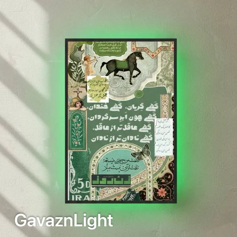 این تابلو بک‌لایت فضایی سرشار از رنگ‌های سبز لایه‌لایه و بافت‌های کاغذی قدیمی را در قالب یک کلاژ منسجم و شاعرانه بازآفرینی کرده است؛ ترکیبی که هم حال‌وهوای چاپ سنگی و پوسترهای وینتیج ایرانی را تداعی می‌کند و هم از زیبایی‌شناسی گرافیکی معاصر الهام گرفته است. حضور نقوش اسلیمی باریک و خوش‌طرح، خطوط منحنی تذهیب، نوشته‌های دست‌نویس، تمبرها و تکه‌کاغذهای یادداشت‌شده، همه در کنار هم دیواری از خاطرات بصری می‌سازند که از دل فرهنگ، ادبیات و زیبایی‌شناسی کلاسیک ایران برآمده است. تصویر اسب تزئین‌شده با زین سبز، پروانه، گل‌ها و نشانه‌های قدیمی چاپی، حالت استعاری و روایی اثر را تقویت کرده و کلاژ را به صحنه‌ای سرشار از نشانه‌های نمادین تبدیل می‌کند. سبزهای تیره، فیروزه‌ای‌های کهنه، کرم‌های فرسوده و خطوط سفید برجسته به کلاژ عمق و تنوع می‌بخشند و حالتی از یک دفترچه بصری قدیمی اما زنده را ایجاد کرده‌اند. نور بک‌لایت سبز یخی که پشت تابلو تابیده، هاله‌ای شدید و درخشان پیرامون اثر ساخته و رنگ‌های سبز حضور یافته در کلاژ را همچون موجی از نور تقویت کرده است. این نور حالتی مدرن و تیز ایجاد می‌کند و لایه‌های چاپی و بافت‌های قدیمی را در تضادی زیبا با نور سبز ساطع‌شده قرار می‌دهد؛ گویی گذشته و حال در یک قاب واحد بدون تردید کنار هم نشسته‌اند. دیوار روشن و بافت ملایم آن اجازه داده نور سبز بازتابی شفاف و یکدست پیدا کند و تابلو همچون یک پنجره نورانی در مرکز فضا بدرخشد. این اثر برای فضاهایی مناسب است که به دنبال ترکیبی از سنت بصری ایرانی، زیبایی‌شناسی چاپ سنگی، حال‌وهوای نوستالژی و یک هاله مدرن و پرقدرت باشند. نور سبز یخی و بافت‌های لایه‌دار اثر، آن را به نقطه‌ای شاخص، برجسته و شخصیتی در هر دکوراسیون مدرن، هنری یا تلفیقی تبدیل می‌کند؛ تابلویی که هم روایت می‌کند و هم می‌درخشد.