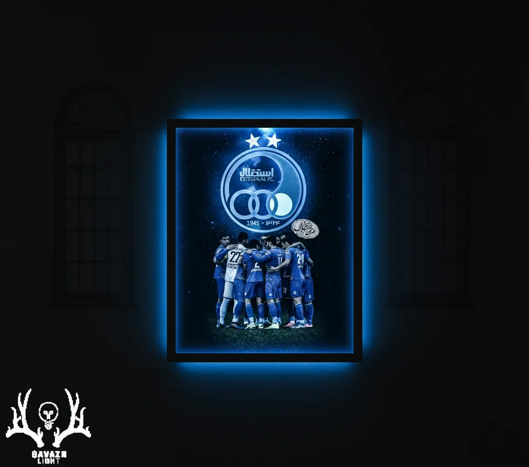 در پایین قاب، بازیکنان در حلقهای صمیمی و متحد ایستادهاند؛ ترکیبی از همدلی، تمرکز و روح تیمی که جوهرهی واقعی استقلال را به تصویر میکشد. ترکیب رنگ آبی تیره با سایههای یخی و طیف نئونی خاص، هویتی یکدست و منسجم به تابلو داده است.