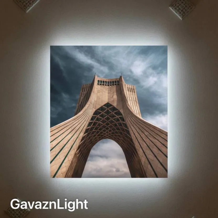 نور بکلایت سفید و خنثی که از پشت تابلو منتشر شده هالهای نرم و یکدست پیرامون تصویر ساخته است؛ هالهای که نه تنها برج را از دیوار جدا میکند و حالت سهبعدیتری به آن میبخشد، بلکه با رنگ آسمان و بافت سنگی برج هماهنگی چشمگیری ایجاد کرده و حس مدرن و مینیمال اثر را تقویت میکند. حضور تزئینات ظریف سقفی و بافت ساده دیوار به عنوان زمینه، باعث شده تصویر برج آزادی مرکز توجه خالص فضا باقی بماند و نور سفید پسزمینه همچون یک قاب نوری بیصدا، به آرامی معماری برج را احاطه کند.