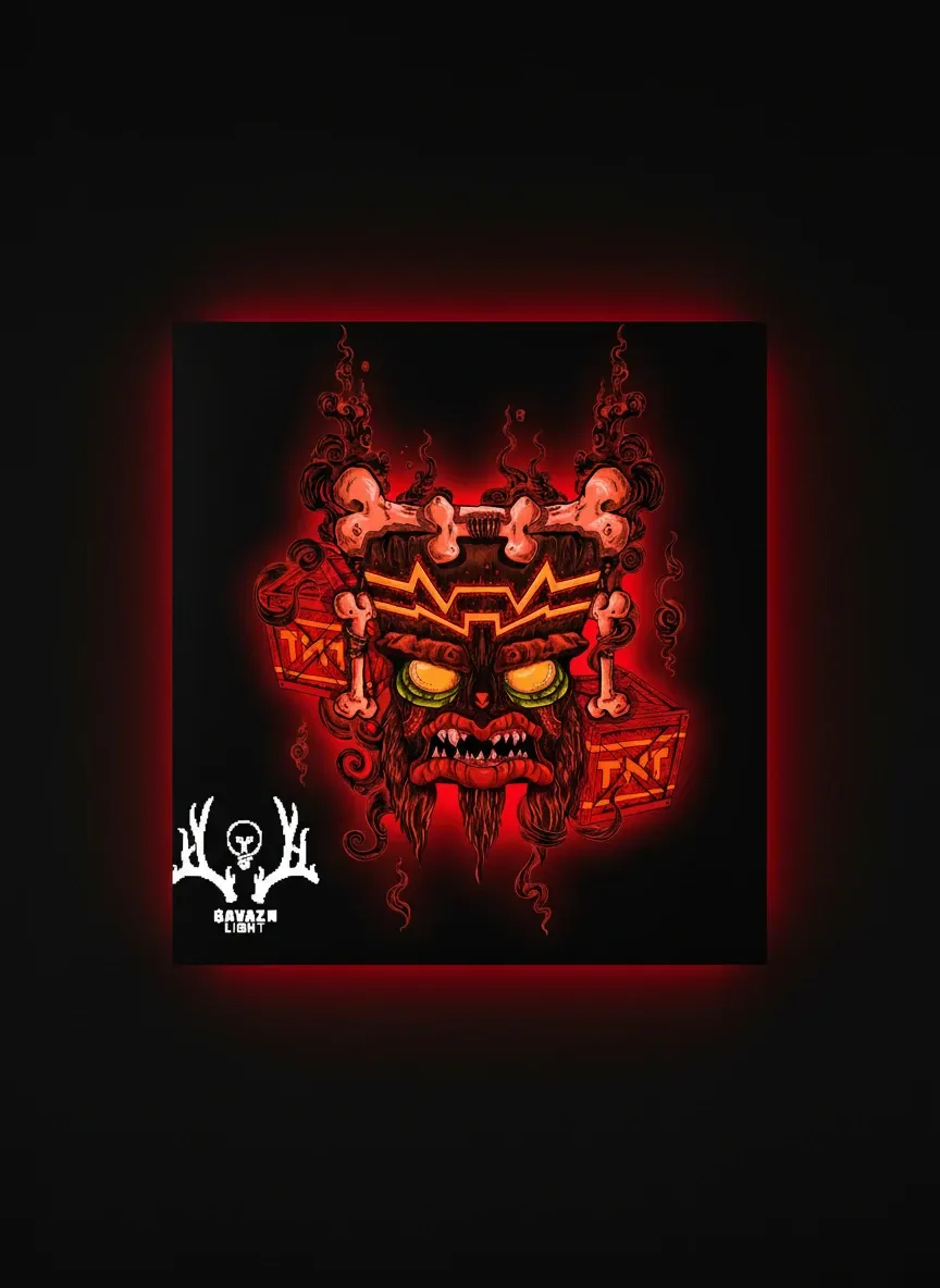 این تابلو بکلایت تصویری خیرهکننده از **Uka Uka**، برادر تاریک Aku Aku در دنیای *Crash Bandicoot* را نمایش میدهد — چهرهای پرقدرت و جادویی با انرژیای که گویی از اعماق آتش زبانه میکشد. رنگهای قرمز، نارنجی و زرد سوزان حالتی انفجاری و تهاجمی ایجاد کردهاند.