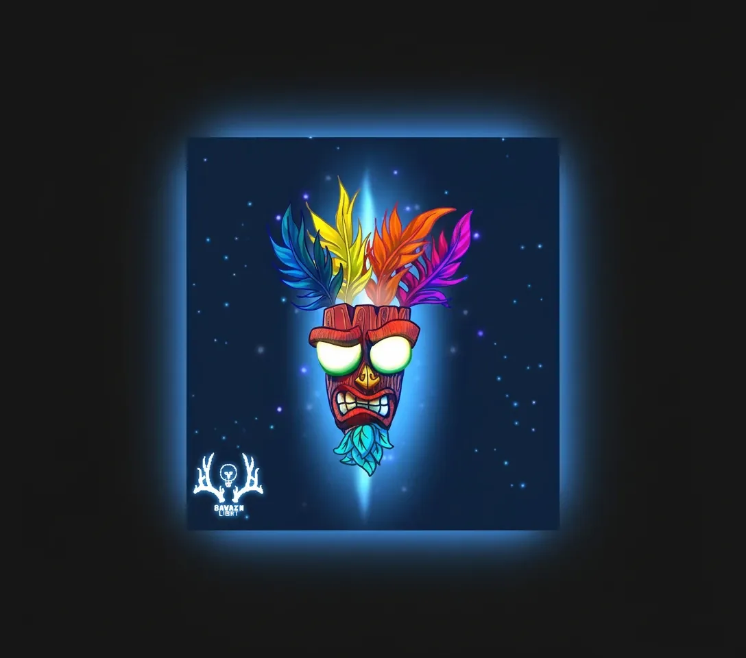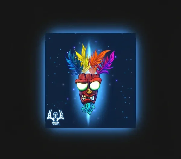 این تابلو بکلایت تصویری از **Aku Aku**، ماسک محافظ اسطورهای در دنیای *Crash Bandicoot* را نمایش میدهد – با انرژی خیرهکنندهای از رنگها و نور نئون که از مرکز به اطراف پخش میشود. پرهای چندرنگ در بالای ماسک (آبی، زرد، نارنجی و بنفش) در برابر پسزمینهی ستارهای شب، جلوهای جادویی و پرتحرک ایجاد کردهاند.