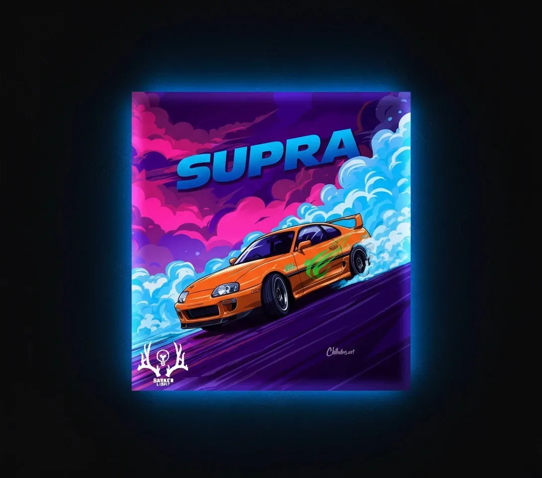 این تابلو بکلایت تصویری دینامیک و پرانرژی از **تویوتا سوپرا نارنجی** را در میانهی دریفتی سینمایی و شتابی برقآسا به نمایش میگذارد؛ الهامی از شور مسابقات خیابانی و فرهنگ رانندگی آزاد. رنگ نارنجی زنده بدنه در تضاد درخشان با پسزمینهی آبی و ارغوانی پر ابر و دود، همزمان حس گرما و سرعت را منتقل میکند. خطوط حرکتی در جاده و تودههای دود سفید/آبی از چرخهای عقب، بیانگر جنبوجوش و انفجار آدرنالین هستند. تایپوگرافی ضخیم و براق **SUPRA** در بالای تابلو، روح جسورانه اثر را تثبیت میکند و ترکیب کلی را به اوج هماهنگی میرساند. چاپ اثر بر روی **تختهشاسی ۸ میلیمتری** انجام شده و نور **آبی نئونی** از **نوارهای ۱۲ ولت** پشت تابلو پخش میشود؛ هالهای که با تونهای آبی تصویر همخوانی کامل داشته و حس ژرفای شب، سرعت و شور نئون را در فضا منعکس میکند — گویی سوپرا در انفجار رنگ و نور، به مرز افسانه رسیده است.