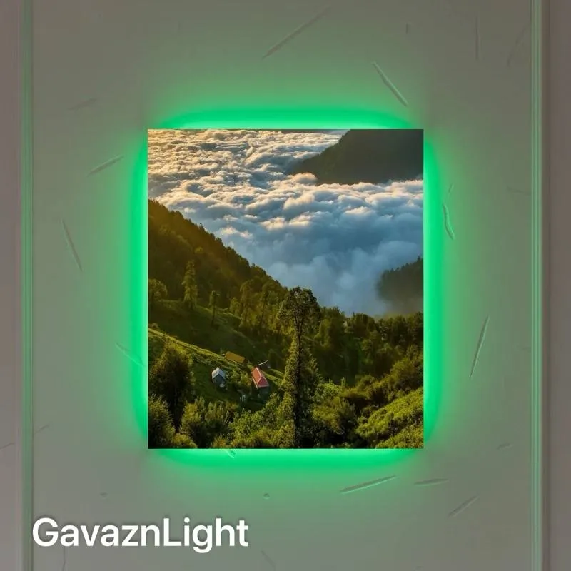این تابلو بک‌لایت منظره‌ای سرشار از طراوت و سکون را پیش چشم می‌گذارد؛ تصویری که از دامنه‌های سبز و پرشیب جنگلی آغاز می‌شود و تا دریایی از ابرهای انباشته و نرم در دوردست امتداد می‌یابد. لایه‌های مه و ابر که در میان دره‌ها نشسته‌اند عمق خیره‌کننده‌ای به صحنه بخشیده و تضاد میان تاریکی کوه‌های سایه‌دار و روشنایی آفتاب نشسته بر لب ابرها حالتی شاعرانه و رؤیایی در تصویر ایجاد کرده است. در میانه دامنه، چند کلبه کوچک با سقف‌های رنگی میان سبزی انبوه پنهان شده‌اند و حس زندگی آرام، روستایی و گریز از喧ه‌ی شهر را به فضا تزریق می‌کنند. بافت شاخه‌ها، پوشش گیاهی و شیب‌های جنگلی به‌گونه‌ای با نور انتهای روز آمیخته شده که گویی طبیعت در حال نفس کشیدن است و هر المان، بخشی از یک سکوت زنده را روایت می‌کند. نور بک‌لایت سبز مخملی که از پشت تابلو منتشر شده هاله‌ای خنک و نافذ پیرامون اثر ساخته و پیوند رنگی دلنشینی با تون‌های عمیق جنگل ایجاد کرده است؛ نوری که نه تنها تصویر را برجسته و سه‌بعدی‌تر جلوه می‌دهد، بلکه حس زندگی و تازگی را بر دیوار امتداد می‌بخشد. بافت مینیمال دیوار و سادگی فضا اجازه داده است که تابلو مرکز دید باشد و هاله سبز همچون بخشی از خود طبیعت در امتداد تصویر عمل کند. این تابلو برای فضاهایی مناسب است که به دنبال آرامش، تازگی و انرژی طبیعی هستند؛ اثری که حضور جنگل و ابر را به اتاق می‌آورد و با نور سبز مخملی خود حالتی پاک، خنک و عمیقاً آرام‌بخش ایجاد می‌کند و در هر دکوراسیون مدرن یا کلاسیک به نقطه‌ای آرامش‌بخش و ماندگار تبدیل می‌شود.