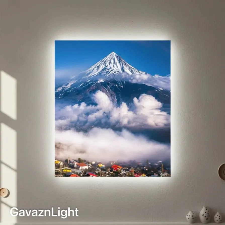 این تابلو بکلایت تصویری زنده و باشکوه از قله دماوند را در لحظهای آمیخته با عظمت و آرامش به نمایش میگذارد؛ قلهای سپیدپوش که همچون نمادی جاودانه بر فراز آسمانی آبی و شفاف ایستاده و لایههای ابر نرم، شناور و حجیم آن را در برگرفتهاند. گذر ابرها بر دامنهها حس حرکت و تنفس طبیعت را زنده کرده و چشم را از عمق آبی آسمان به سفیدی مه و سپس به دهکده رنگارنگ پاییندست هدایت میکند؛ جایی که سقفهای زنده و پررنگ خانهها همچون لکههایی از زندگی در دل منظرهای عظیم میدرخشند. این تضاد میان سکوت کوهستان و حضور گرم زندگی انسانی، تصویر را به ترکیبی پویا و سرشار از حس حیات بدل کرده است. نور سرد و دقیق بکلایت همچون هالهای روشن پشت تصویر میتابد و باعث میشود قله دماوند جلوهای سهبعدی پیدا کرده و از دل دیوار بیرون بزند. دیوار مینیمال و روشن محیط، سایهی نرم نور روز و چینش سادهی المانهای تزئینی اطراف، نمایش تابلو را تمیز، مدرن و منسجم کردهاند؛ گویی این منظره طبیعی با نور خاص خود فضای اتاق را روشن میکند. این اثر برای کسانی که به دنبال ثبت ابهت طبیعت ایران در قالبی روشن، آرام و الهامبخش هستند انتخابی ممتاز است؛ تصویری که هر بار نگریسته میشود حس سکون، استواری و زیبایی بیانتها را زنده میکند.