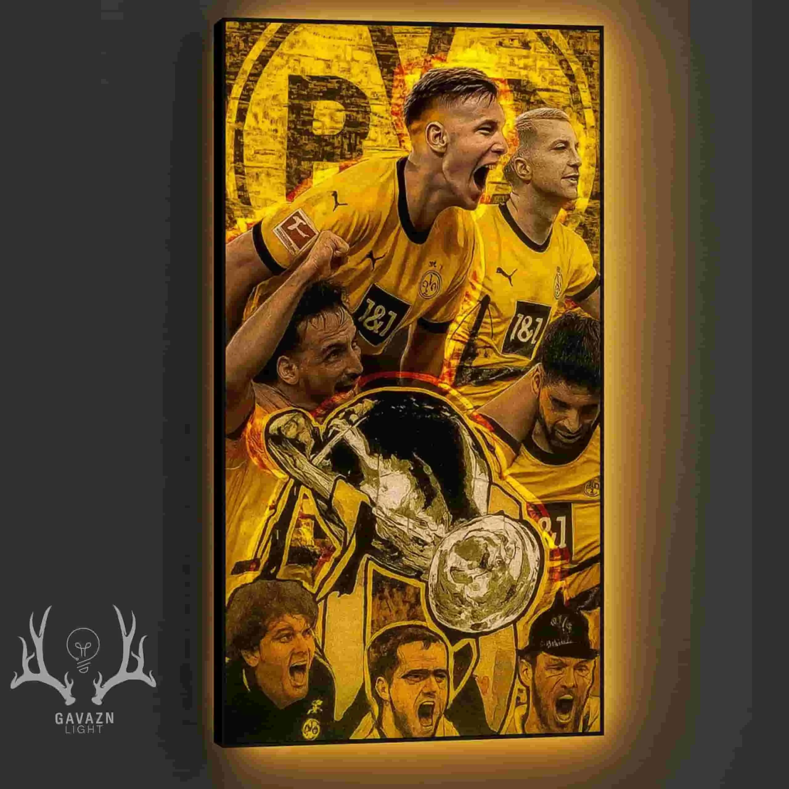 این تابلو یک کلاژ قدرتمند و پرانرژی از لحظات شور و هیجان تیم بروسیا دورتموند را با ترکیبی از تصاویر بازیکنان جدید و قدیمی به نمایش گذاشته است. تم رنگی اصلی، زرد و مشکی اصیل باشگاه را با بافتی شبیه به زنگار روی پسزمینهی لوگوی دورتموند به کار برده که جلوهای تاریخی و در عین حال مدرن ایجاد کرده است. اثر با دقت بالا روی تختهشاسی هشتمیلیمتری چاپ شده است و نوارهای ۱۲ ولت، نور پسزمینهای یکنواخت به رنگ زرد طلایی قوی و یکدست ایجاد میکنند. این نور از لبههای باریک تابلو به بیرون تابیده و هالهای درخشان و پرحرارت روی دیوار به وجود میآورد که قدرت رنگ زرد را دوچندان میکند. پوشش مات ضدانعکاس و طراحی بدون قاب، جزئیات پیچیدهی کلاژ را با وضوح بالا حفظ کرده و اثر را به صورت شناور و برجسته به نمایش میگذارد؛ شاهدی بر قدرت و هیجان بیپایان دورتموند.