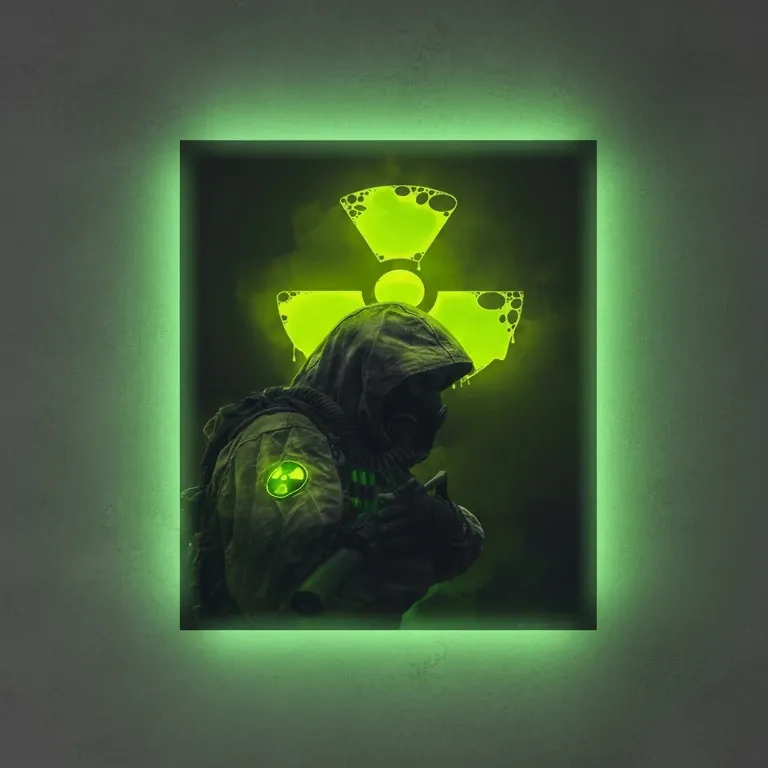 چاپ با کیفیت بالا بر روی **تختهشاسی ۸ میلیمتری** انجام شده و نور پسزمینهی **سبز رادیواکتیو خالص (Toxic Neon Green 12V)**، حاشیه اثر را درخشان کرده و حس تهدید و هیجان علمی-نظامی را زنده نگه میدارد. ترکیب سایههای مشکی گازآلود با درخشش سبز سمّی، موقعیتی از مرز میان زندگی و نابودی را به نمایش میگذارد.