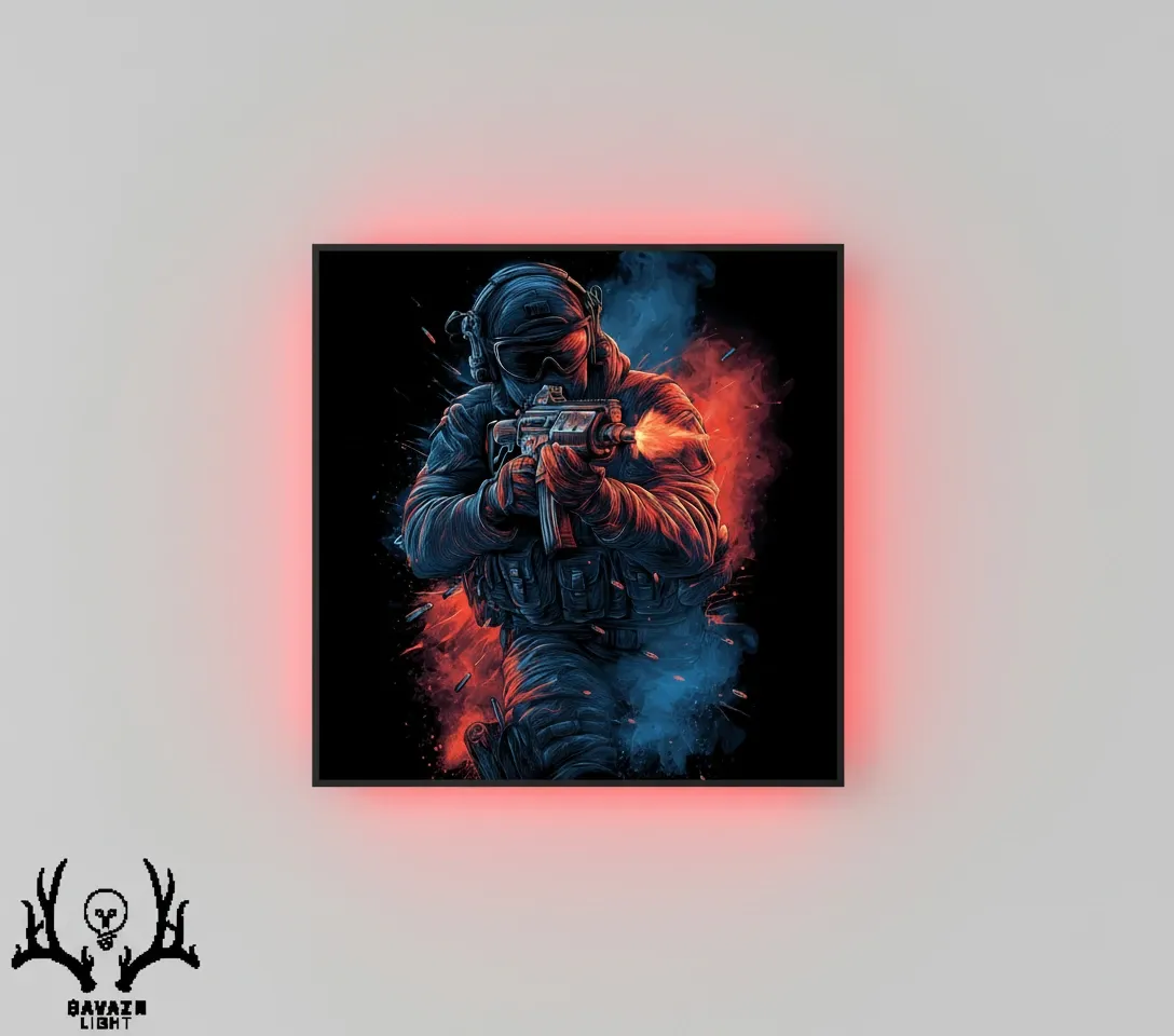 تابلو بک‌لایت **گوزن لایت – Ghost Reaper 141** تصویری سینمایی از سرباز ویژه در میان درهم‌تنیدگی **شعله‌های قرمز و دود آبی نظامی** است؛ تضاد شعله و یخ در این طراحی، معناگر دوگانگی نیرو و تمرکز در میدان نبرد مدرن است. چاپ با **کیفیت فوق‌العاده روی تخته‌شاسی ۸ میلی‌متری** انجام شده و نور بک‌لایت از نوع **قرمز آتشین (Inferno Red 12V)** از پشت پنل در فضای **دیوار خاکستری مات** منتشر می‌شود؛ جلوه‌ای پرحرارت و تاکتیکال که حس شجاعت و فرمان‌پذیری دقیق را القا می‌کند.