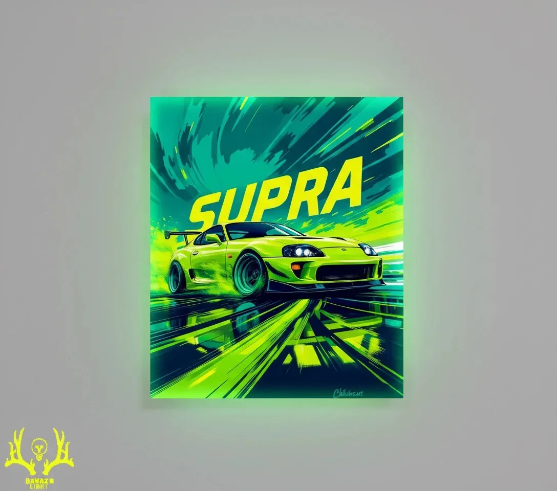 این تابلو بک‌لایت جلوه‌ای خیره‌کننده از **تویوتا سوپرا زرد** را در میان انفجار رنگ و سرعت به تصویر می‌کشد؛ لحظه‌ای که خطوط نئونی سبز و زرد در پس‌زمینه شکافته می‌شوند و حس حرکت انفجاری، سرعت و قدرت ناب را انتقال می‌دهند. زاویه دید مورب خودرو پویا و تهاجمی است، چرخ‌ها در حال چرخش، و بازتاب خطوط انرژی بر سطح جاده خیس نوعی تحرک سینماتیک در اثر ایجاد کرده است. فونت بزرگ کلمه **SUPRA** در بالای طرح همانند فریادی از قدرت و هیجان، محور اصلی ترکیب را تثبیت می‌کند. چاپ اثر روی **تخته‌شاسی ۸ میلی‌متری** انجام شده و نور **سبز نئونی خالص** از **نوارهای ۱۲ ولت** پشت تابلو به شکلی یکنواخت تابیده می‌شود؛ نوری که از حاشیه‌ها به بیرون فوران کرده و با رنگ غالب تصویر ترکیب می‌گردد تا جلوه‌ای الکتریکی و پرشتاب خلق کند؛ گویی سوپرا در میانه‌ی انفجار نور و زمان، از دل واقعیت به دنیای نئون گام گذاشته است.