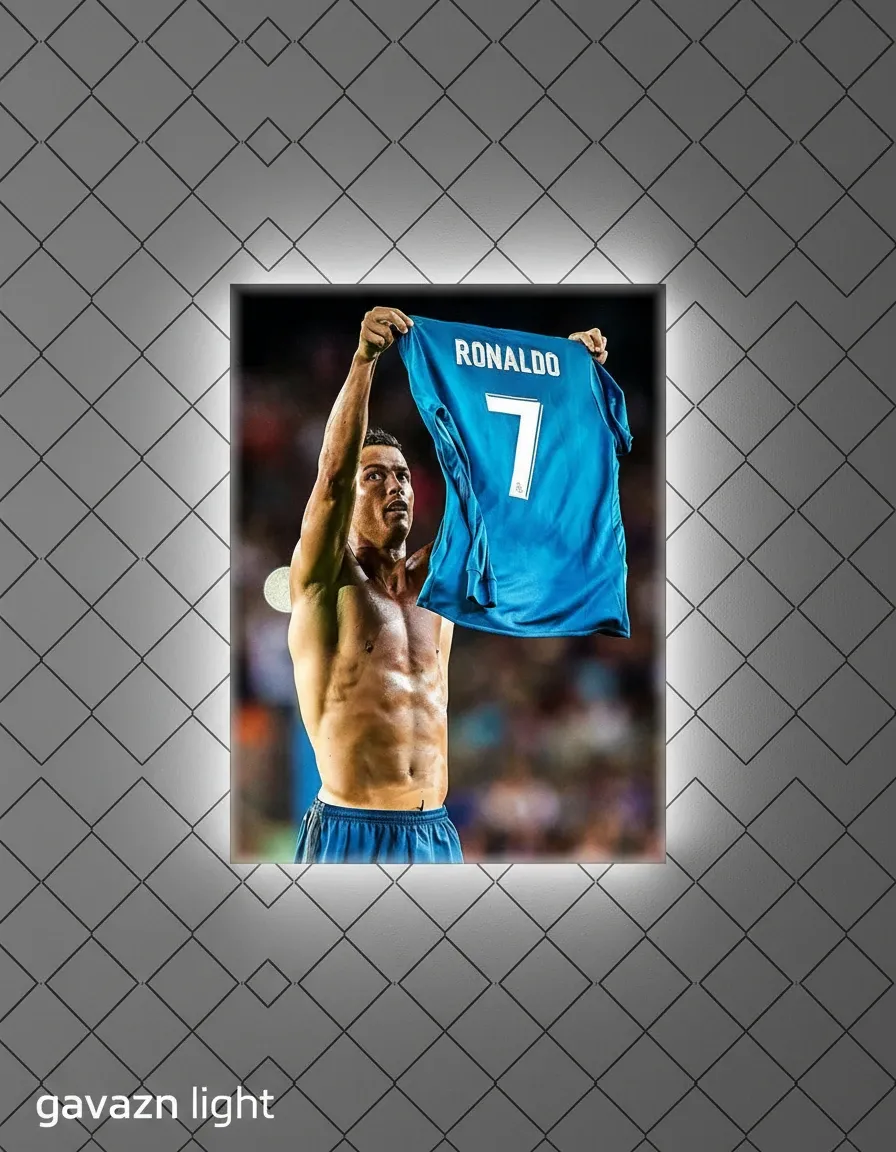 در این اثر بی‌نظیر، اوج افتخار ستاره‌ی پرتغالی در نمایش پیراهن معروف شماره ۷، با رنگ و نور بازسازی شده است. پس‌زمینه تاریکِ استادیوم و لباس آبی الماسی، با درخشش LED سفید خالص از پشت تابلو، احساس پیروزی، تمرکز و قدرت را به شکلی جاودانه بازتاب می‌دهد. چاپ بک‌لایت با وضوح بالا سبب شده تک‌تک جزئیات عضلانی و سایه‌های رنگی، جلوه‌ای سه‌بعدی و پویا پیدا کنند. ساختار فریم‌لس روی شاسی ۸ میلی‌متری باعث شده نور به نرمی روی دیوار پخش‌ شود و تابلو جلوه‌ای موزه‌مانند بگیرد. انتخابی بی‌بدیل برای کلکسیونرها، اتاق هواداران فوتبال یا سالن‌های ورزشی مدرن.