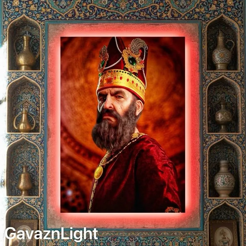 این تابلو بکلایت جلوهای مجلل و سلطنتی دارد و تصویری الهامگرفته از شکوه پادشاهان ایرانی را در مرکز خود جای داده است. پسزمینهای با تونالیته گرم و عمیق مانند بافت طلایی و آتشگون کاخهای کهن، فضای اصلی تصویر را احاطه کرده و تضاد زیبایی میان رنگهای سرخ مخملی لباس و نور درخشان محیط ایجاد میکند. تاجی آراسته به سنگهای رنگین، نقشونگارهای طلایی و تزئینات دستساز سنتی در بالای تصویر قرار دارد و حس وقار و قدرت را تقویت میکند. نور بکلایت سرخ که از پشت تابلو بیرون میتابد به تصویر عمق میدهد و آن را به نقطه تمرکز فضا تبدیل میکند. قاب اطراف اثر با معماری مزین ایرانی، مقرنسهای آبی و طلایی و ظروف سنتی در طاقچههای کوچک ترکیب شده و حالوهوای یک ایوان تاریخی را به یاد میآورد. مجموعه رنگها، نورپردازی و جزئیات این تابلو را به گزینهای شاخص برای دکوراسیونهای کلاسیک ایرانی، فضاهای هنری با تم سلطنتی یا خانههایی با چیدمان گرم و فاخر تبدیل کرده است.