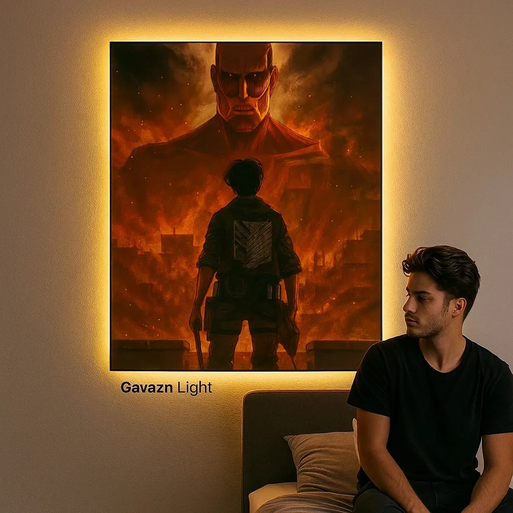 تابلو بک لایت طرح ارن یگرتصویری از شجاعت بیپایان انسان در برابر قدرت مطلق است — مناسب برای اتاق، گیمریوم یا محیط هنری مدرن با دکوری مینیمال و نور ملایم.