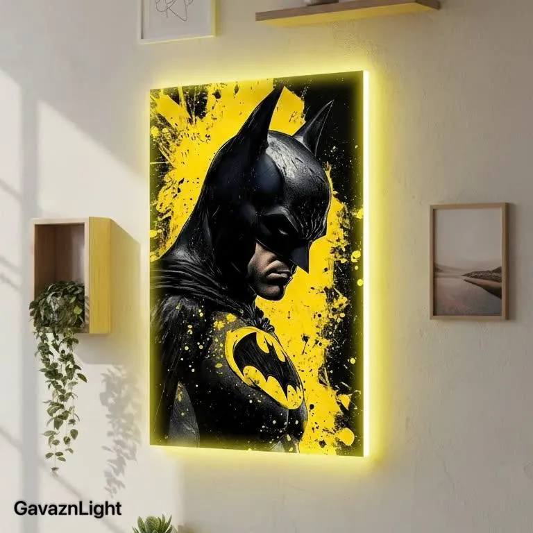 این اثر، بتمن را با رویکرد گرافیتی/اسپری‌آرت شهری نمایش می‌دهد؛ ترکیب رنگ زرد پرانرژی، جلوهٔ پرتحرک و دراماتیکی به پس‌زمینه می‌بخشد، در حالی که لباس و شنل مشکی قهرمان، تضاد بصری قدرتمندی خلق می‌کنند. لوگوی نمادین زرد-مشکی بتمن به‌عنوان نقطهٔ کانونی، بالانس ایده‌آل میان رنگ و فرم را حفظ می‌کند. نور طلایی گرم با LED ۱۲ولت، هم‌خوانی کامل با تونالیتهٔ زرد اثر دارد و حس روشنایی و گرمای قهرمانانه را به فضای اتاق اضافه می‌کند. این نوع نور باعث می‌شود فضای پوستر حس زنده بودن و تحرک پیدا کند. کاربرد دکوراسیون پیشنهادی مناسب برای اتاق‌های نوجوانان، کلکسیونرهای کمیک‌بوک، فضاهای الهام‌بخش کاری یا گالری‌های شخصی با تم ابرقهرمانی. ترکیب این تابلو با آثار بتمن یا جوکر در مجموعه، جلوهٔ داستانی دو‌قطبی جذابی ایجاد می‌کند.