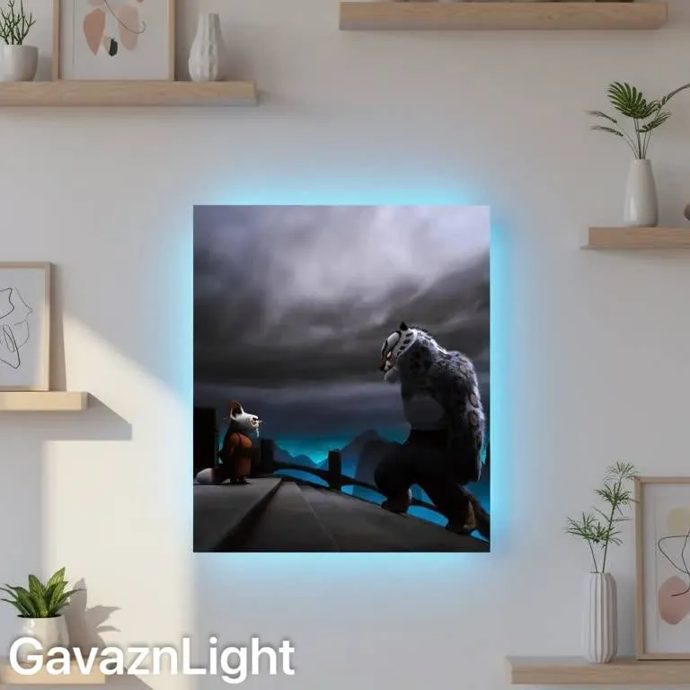 ین تابلو صحنه‌ای نمادین از برخورد پرتنش میان دو قدرت متضاد را بازآفرینی می‌کند: پو، نماینده آرامش و معنویت، در برابر تای لانگ، تجسم خشم و جاه‌طلبی. آسمان تیره و ابرهای سنگین نمادی از نبرد درونی و خارجی هستند، در حالی که نور آبی یخی پشت تابلو، حس موقر و سرد انتظار پیش از طوفان را تقویت می‌کند. این نور همچنین پوشش فلزی و بافت پوست کاراکترها را به شکل دراماتیک برجسته می‌سازد. مناسب برای فضاهای دارای تم طبیعت سرد، سبک‌های مدرن، و اتاق‌هایی که نور آبی زمینه آن را کامل می‌کند (مانند دفاتر خلوت یا فضاهای تأملی). هماهنگ ترین تاثیر بصری را در کنار تابلوها (Death Note – L and Ryuk)   (Homer Simpson – Starry Night Rest) ایجاد می‌کند؛ هر سه اثر هویتی سکون، تأمل و اراده در دل فضای سرد نور آبی خود دارند.