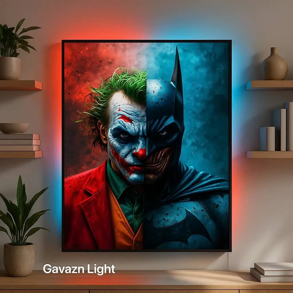 این اثر بر روی **تختهشاسی فشرده ۸ میلیمتری** چاپ شده و نور بکلایت **LED ۱۲ ولت دوگانه (Inferno Red + Arctic Blue)** به شکلی هوشمندانه در چپ و راست قاب بهکار رفته است؛ بهگونهای که سوی قرمز نماد آشوب جوکر و سوی آبی نماد آرامش بتمن را تقویت میکند. این تضاد نوری، تابلو را به اثری سینمایی و مفهومی بدل کرده است.