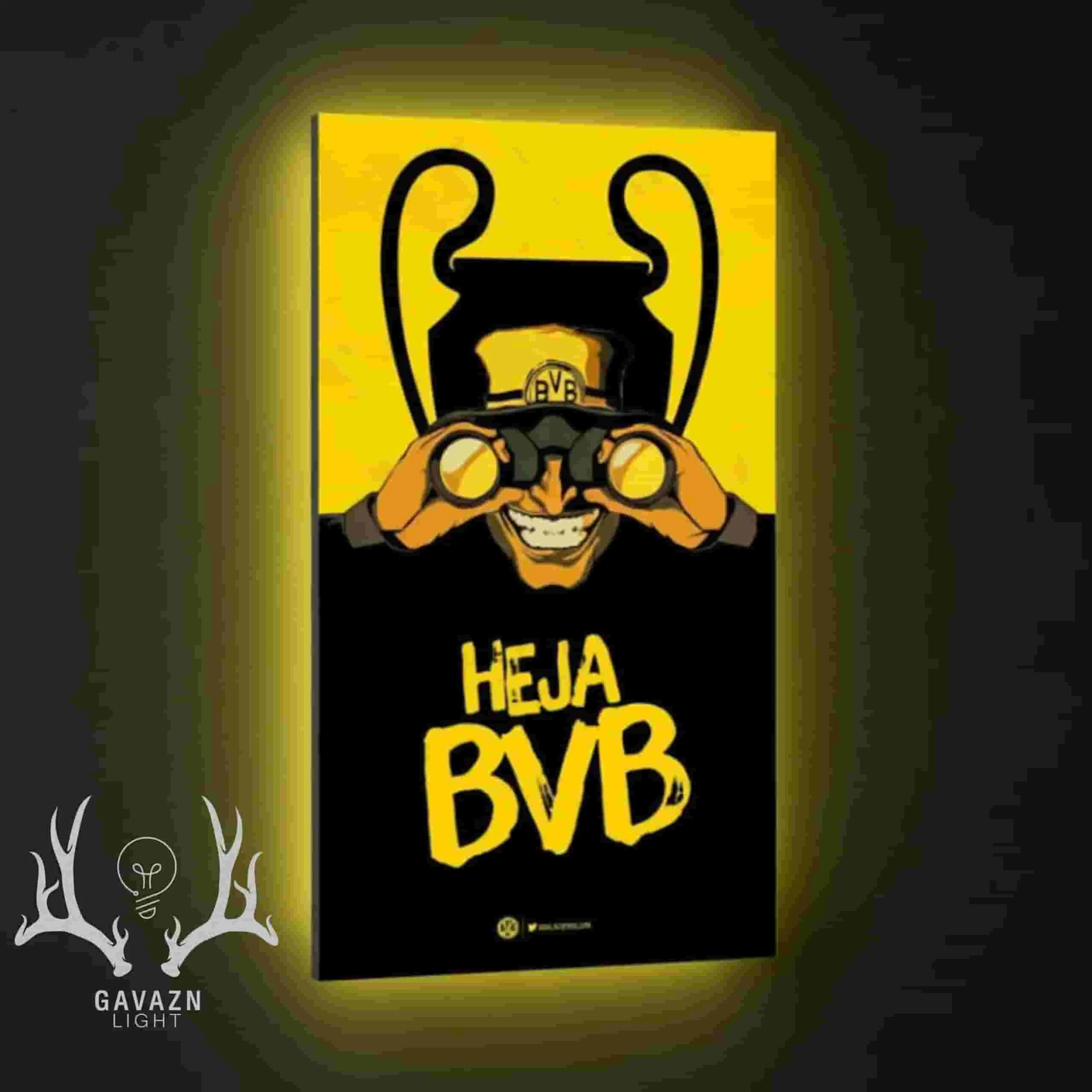 این تابلو با طراحی خاص و کاریکاتوری، نمایشی جسورانه و طرفدارانهی باشگاه بروسیا دورتموند است که با شعار “HEJA BVB” شور و هیجان تیم را منتقل میکند. ترکیب رنگهای زرد لیمویی شدید و مشکی مات، تضادی خیرهکننده و انرژیبخش به وجود آورده است. این اثر روی تختهشاسی هشتمیلیمتری با چاپی بسیار با کیفیت نصب شده است. نورپردازی پسزمینه از طریق نوارهای ۱۲ ولت، هالهای از نور زرد لیمویی قوی و یکنواخت در اطراف تابلو ایجاد میکند که انرژی بصری تصویر را چند برابر کرده و حس درخشندگی و هیجان را به محیط میبخشد. طراحی بدون قاب و لبههای پنهان مشکی، باعث میشود تابلو در فاصلهی کمی از دیوار بهصورت شناور قرار گیرد و این نور زرد شدید، به طور کامل به فضای اطراف پرتاب شود. پوشش مات ضد انعکاس، سیاهی عمیق و زردی پررنگ تصویر را بدون هیچگونه بازتاب مزاحمی به نمایش میگذارد و یک اثر هنری مدرن و مملو از حس طرفداری را خلق میکند.