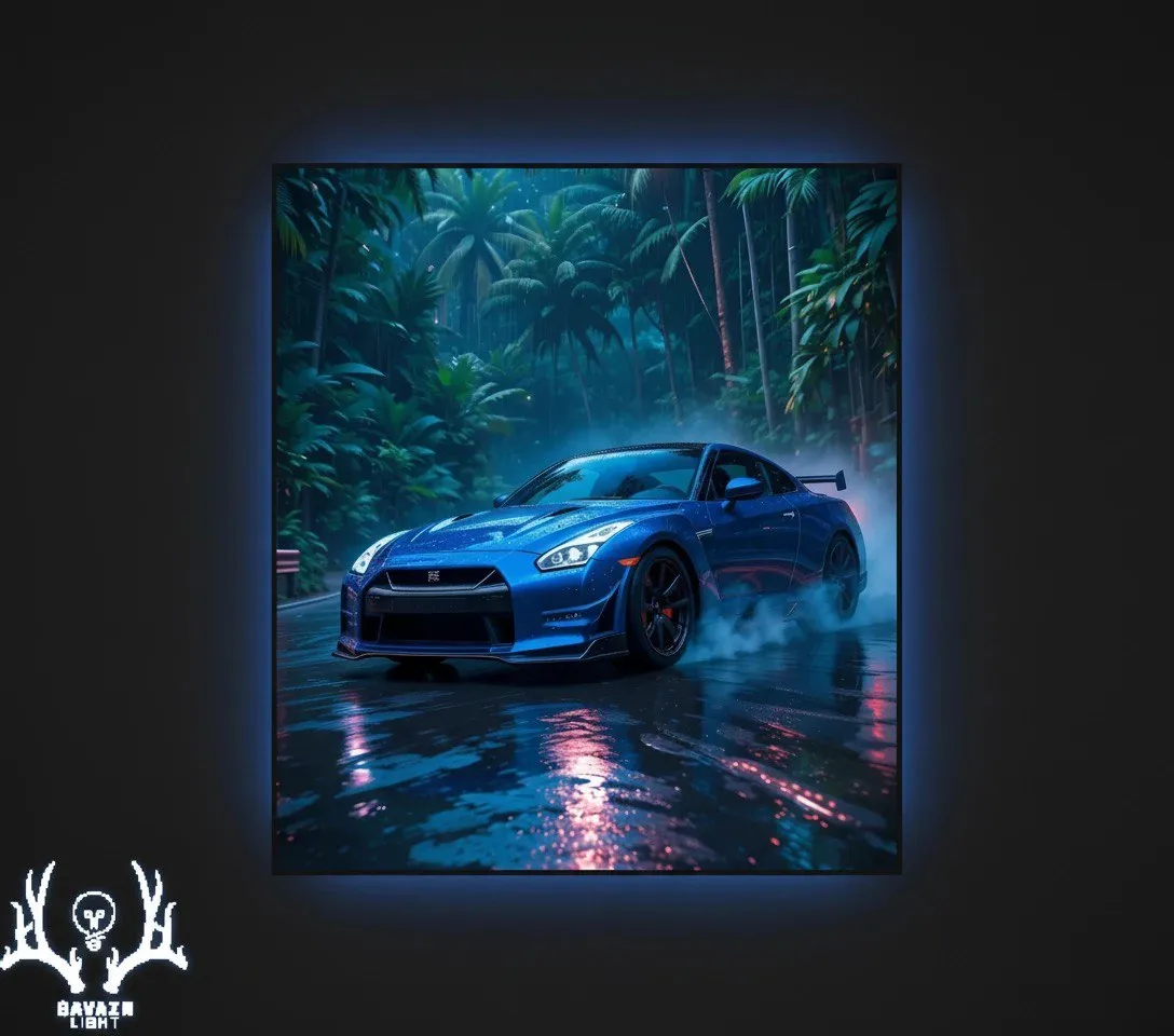 این تابلو بکلایت نمایی پرقدرت از **Nissan GT‑R** آبی تیره را در جادهای بارانی میان جنگلهای استوایی به تصویر کشیده است. برگهای نخل و مه نمناک در پسزمینه، فضای مرطوب و سنگین را القا کرده و انعکاس سطح خیس آسفالت، درخشش نئونهای سرد و جزئیات خطوط بدنه را دوچندان کرده است. زاویهی سهربع جلو با تایرهای خیس و بخار اسپرت ناشی از شتاب خودرو، جلوهای سینمایی و پرتنش به اثر داده است.