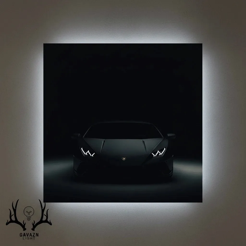 این تابلو بک‌لایت نمایی مرموز و مینیمال از لامبورگینی هوراکان مشکی مات را در تاریکی مطلق به تصویر کشیده است؛ جایی که تنها خطوط تیز بدنه و چراغ‌های خشمگین جلو با دقتی بی‌نقص از دل سایه‌ها بیرون آمده‌اند. ترکیب نور و سیاهی در این اثر، حس قدرت نهفته و سکوتی پرهیبت را القا می‌کند که گویی خودرو آماده‌ی انفجاری از سرعت است. چاپ طرح بر روی تخته‌شاسی هشت‌میلی‌متری انجام شده و نورپردازی دقیق آن با نوارهای ۱۲ ولت اجرا گردیده است. هاله‌ی سفید یخی از پشت تابلو، همانند مهی نازک در اطراف خودرو پخش شده و تضاد عمیقی با تاریکی درون تصویر ایجاد کرده است. این هماهنگی میان شدت نور و مینیمالیسم تصویر، تابلو را به نمادی از ابهت و ظرافت تبدیل می‌کند که حضور آن در هر فضا حس سکوت لوکس و قدرت مهار‌شده را تداعی می‌نماید.