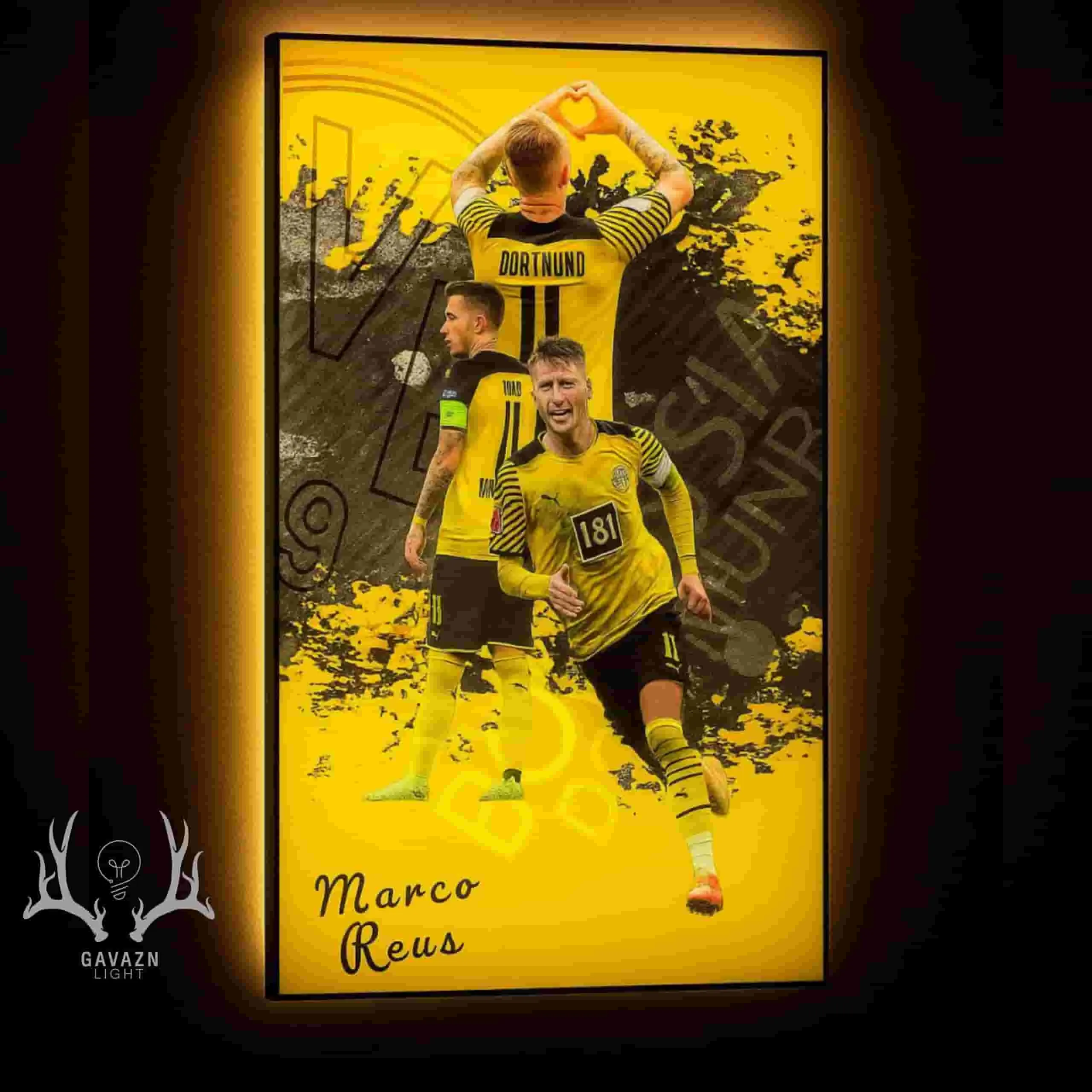 این تابلو، تجلیل باشکوهی از مارکو رویس و وفاداری او به باشگاه بروسیا دورتموند است. طراحی پویا با ترکیب سه حالت متفاوت از رویس در لحظه‌های نمادین بازی، حس تحرک و شجاعت دائمی او را منتقل می‌کند. پس‌زمینه با تلفیق رنگ‌های زرد و مشکی باشگاه و پاشش‌های انتزاعی در اطراف بازیکن، عمق و پویایی چشم‌گیری ایجاد کرده است. لوگوی دورتموند با بافت نیمه‌محو در پس‌زمینه دیده می‌شود که اصالت و هویت تیم را تقویت می‌کند. چاپ اثر روی تخته‌شاسی هشت‌میلی‌متری با جزئیات دقیق و پوشش مات ضدانعکاس انجام شده است. نورپردازی از نوارهای ۱۲ ولت پشت تابلو، هاله‌ای زرد روشن و یکدست به وجود آورده که از لبه‌ها به دیوار پراکنده می‌شود و وضوح و قدرت رنگ لباس را افزایش می‌دهد. طراحی بدون قاب و شناور، موجب شده نور به شکلی بی‌مرز و طبیعی گسترش یابد و تابلو جلوه‌ای خیره‌کننده و مدرن پیدا کند؛ اثری که نه‌تنها تصویر رویس، بلکه روح باشگاه دورتموند را زنده نگاه می‌دارد.