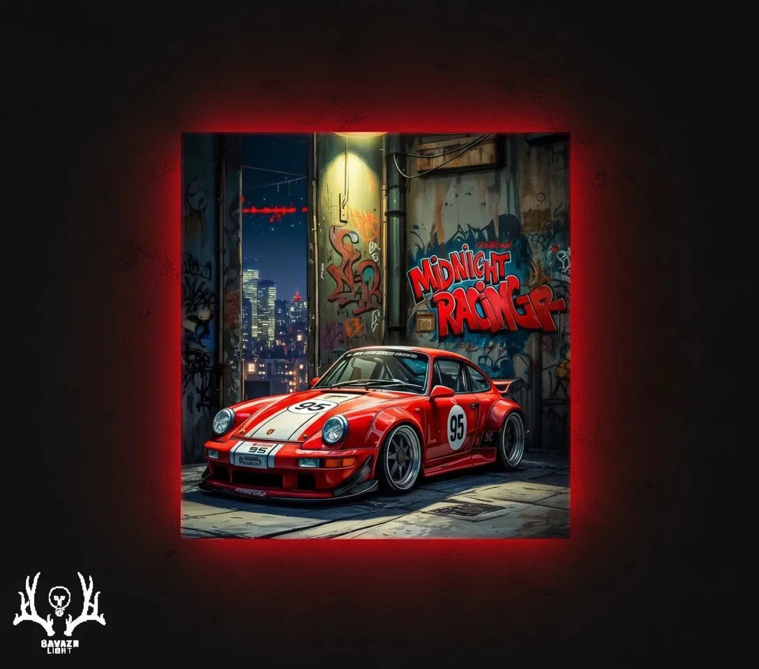این تابلو بکلایت تصویری پرقدرت و شهری از یک ماشین مسابقهای قرمز در کوچهای پر از گرافیتی و نورهای شبانه را به نمایش میگذارد؛ صحنهای که شور رقابت، هیجان شب و هنر خیابانی را همزمان ترکیب کرده است. متن **MIDNIGHT RACER** با استایل گرافیتی در پسزمینه، روح خیابانهای نئونی و نبض آدرنالین را تداعی میکند. نورهای شهری از دور، انعکاس فلز و رنگ قرمز درخشان بدنه، حس سرعت و تمرکز شبگردی را القا میکند. جزئیات طراحی مانند لاستیکهای پهن، خطوط سفید مسابقه و زاویه دید نزدیک، انرژی مکانیکی این اثر را به اوج رساندهاند. چاپ صحنه روی **تختهشاسی ۸ میلیمتری** انجام شده و نور **قرمز آتشین** از **نوارهای ۱۲ ولت** پشت تابلو بهصورت یکنواخت پخش میشود؛ نوری که از پس زمینه به بیرون میتابد و با رنگ بدنه تلفیقی پرشور میسازد، گویی انرژی مسابقه نیمهشب از قاب تابلو به دیوار جاری میشود.