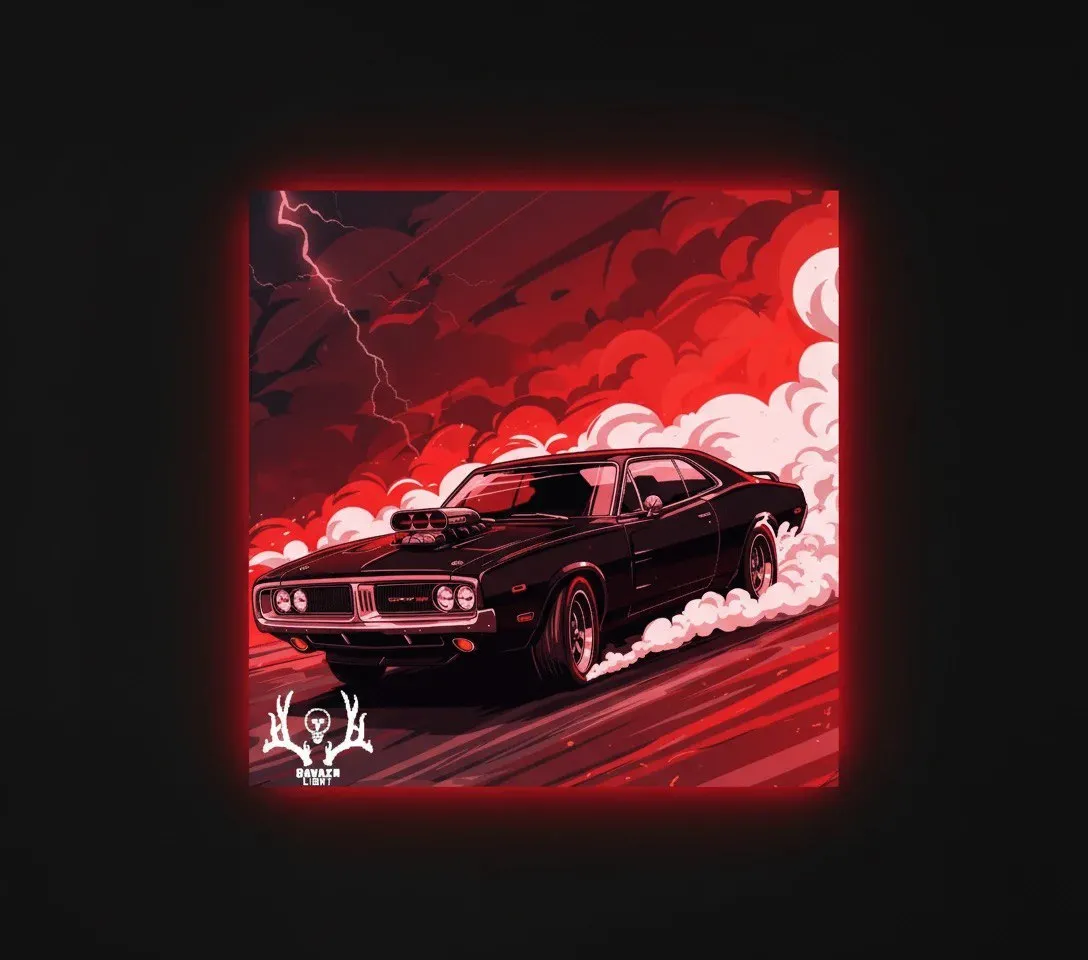 این تابلو بکلایت تصویری از یک **داج چارجر کلاسیک مشکی** را در اوج قدرت و سرعت به نمایش میگذارد؛ صحنهای پرتنش و سینمایی که خودرو در میان موجی از دود سفید و شعلههای سرخ در حال شتابگیری است. پسزمینه آسمان با رعد و برق و ابرهای قلّابی سوزان، فضای طوفانی و پرهیجانی را القا میکند. تضاد بینقص میان رنگ سیاه براق بدنه و درخشش قرمز محیط، انرژی بیمهار و خشونت کنترلشده موتور را برجسته میسازد. چاپ اثر بر روی **تختهشاسی ۸ میلیمتری** انجام شده و نور **قرمز آتشین** از **نوارهای ۱۲ ولت** پشت تابلو، حالتی از انفجار بصری ایجاد کرده است؛ نوری که از حاشیهها میدرخشد و با سایههای سیاه و خطوط پرشتاب پسزمینه ترکیب میشود تا حس حرکت، قدرت و طغیان مکانیکی به اوج برسد.