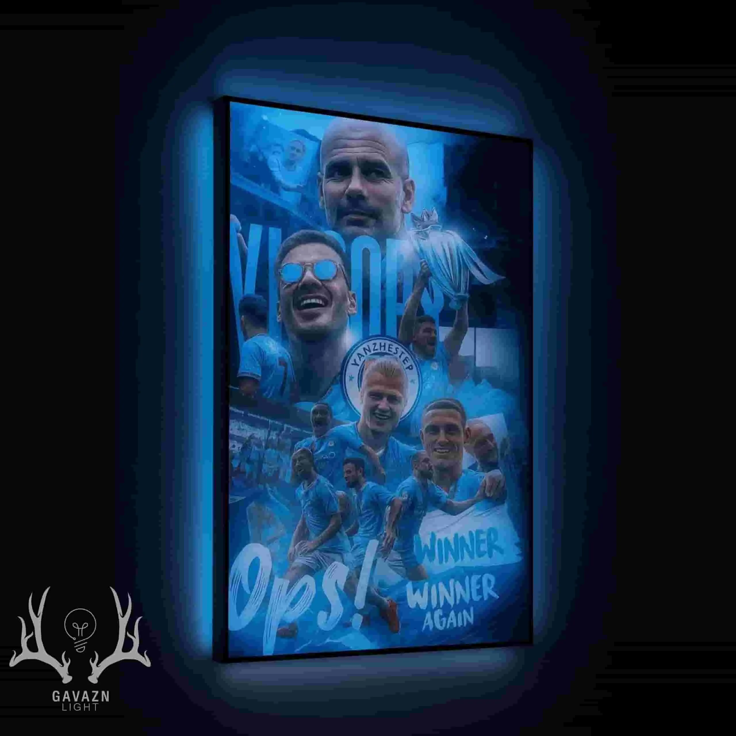 این تابلو ویژهی قهرمانی منچستر سیتی، تجسمی از شکوه و انسجام تیم در لحظات اوج مسابقات است. طراحی پویا و ترکیب چندین صحنه از شادی بازیکنان با جام قهرمانی، حس همدلی و پیروزی جمعی را به بیننده منتقل میکند. رنگ غالب آبی آسمانی با تهمایههای نئون، فضای اثر را بهصورت درخشان و پرتحرک درآورده و هماهنگی کاملی با هویت بصری باشگاه دارد. چاپ با وضوح بالا روی تختهشاسی هشتمیلیمتری انجام شده و پوشش مات ضدانعکاس، شفافیت و عمق رنگها را حفظ کرده است. نورپردازی محیطی از نوارهای نوری ۱۲ ولت در پشت تابلو، هالهای آبی یخی و یکنواخت پدید آورده که از لبهها به دیوار تابیده و حس طراوت و برتری را تقویت میکند. طراحی بدون قاب و ساختار شناور، به تابلو جلوهای مدرن و لوکس بخشیده و آن را به نماد افتخار و پیروزی دوبارهی آبیهای منچستر تبدیل کرده است.