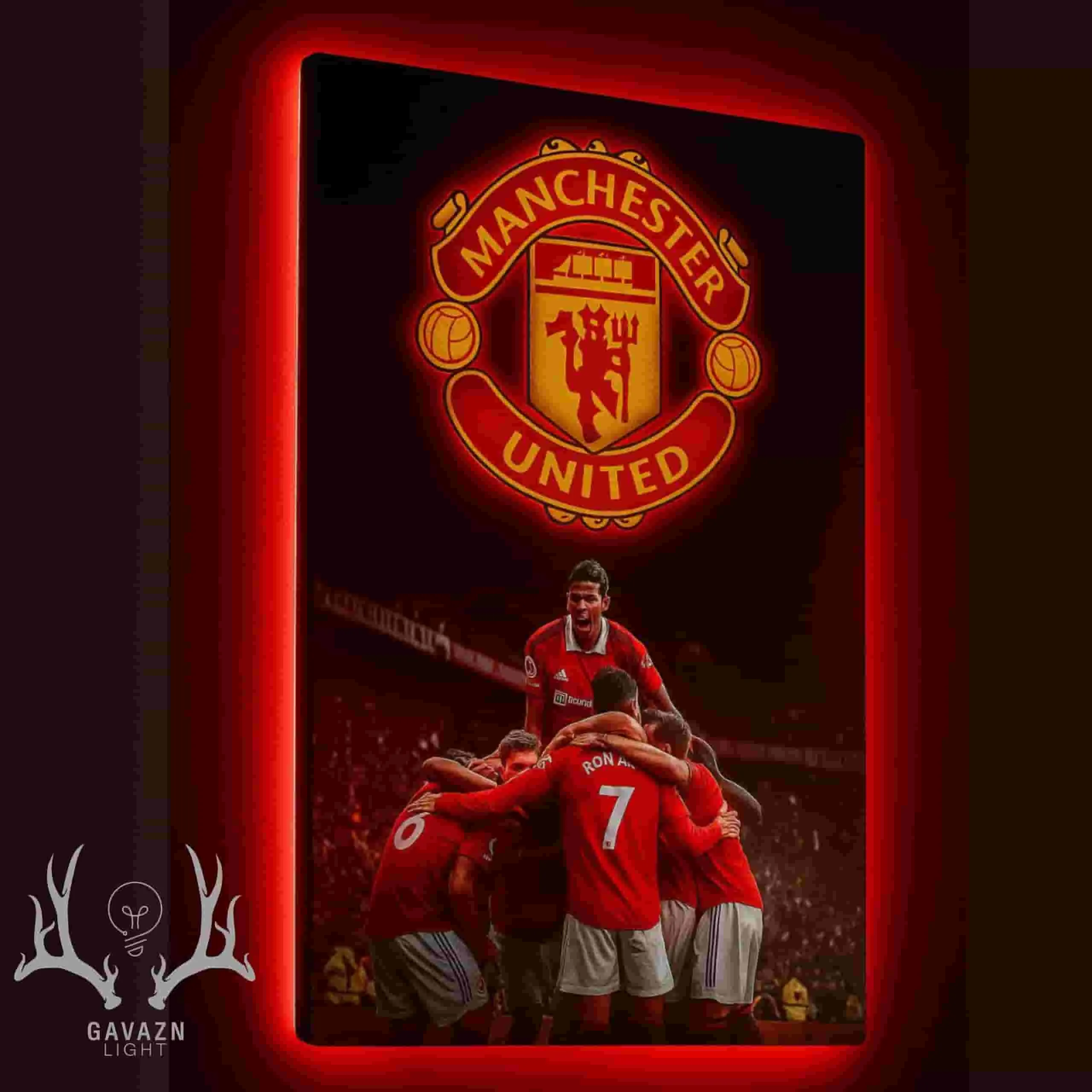 این تابلو باشکوه از باشگاه منچستر یونایتد، نمادی از اتحاد، قدرت و میراث سرخ شیاطین است. در بخش بالای تصویر، لوگوی طلایی و سرخ باشگاه با عمقی بصری نمایان است و در پایین، صحنهی هیجانانگیز شادی پس از گل بازیکنان، از جمله شماره هفت افسانهای، شور و حرارت تیم را منتقل میکند. این اثر روی تختهشاسی هشتمیلیمتری و با پوشش لمینت مات اجرا شده است. نورپردازی از پشت تابلو توسط نوارهای ۱۲ ولت، هالهای قدرتمند و عمیق از رنگ قرمز آتشین ایجاد کرده که به شکلی یکنواخت و گسترده روی دیوار پخش میشود و اصالت رنگ باشگاه را تقویت میکند. طراحی بدون قاب و فوقالعاده باریک با عمق کم، باعث میشود تابلو بهصورت شناور و مدرن دیده شود، در حالی که لبههای پنهان مشکی بر کنتراست شدید میان تابلو و نور پسزمینه تأکید میکنند. این تابلوی نورانی، تجلیبخش انرژی و عظمت منچستر یونایتد با کیفیتی استثنایی و یک نور محیطی خیرهکننده است.
