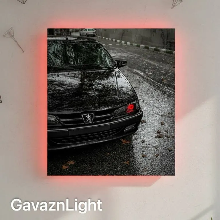 این تابلو بک‌لایت تصویری از یک پژوی مشکی را در فضایی بارانی و خیابانی به نمایش می‌گذارد؛ سطح خیس آسفالت و قطرات باران روی بدنه خودرو حال‌وهوایی سرد، سینمایی و نوستالژیک ایجاد کرده است، گویی صحنه از دل یک فیلم شهری گرفته شده باشد. انعکاس شاخه‌های درختان روی کاپوت و شیشه جلو نوعی بافت طبیعی و تیره به تصویر می‌دهد که در کنار تیرگی رنگ خودرو، حس آرام اما پرکشش فضا را تقویت می‌کند. تنها نقطه درخشان تصویر چراغ کوچک قرمز در گوشه جلوست که همچون چشم یک موجود شهری در شب می‌درخشد و تمرکز نگاه را به سوی خود می‌کشاند. این نقطه نورانی در تضاد کامل با محیط نم‌دار و خاکستری اطراف قرار گرفته و انرژی‌ای مرموز و کمی خشن به صحنه می‌بخشد. نور بک‌لایت قرمز اطراف تابلو نیز این تضاد را تشدید کرده و قاب را به شکلی دراماتیک روشن می‌کند، به‌گونه‌ای که خودرو همچون قهرمانی ساکت در مرکز درخششی مخملی قرار گرفته است. بر روی دیوار ساده و روشن، این نورپردازی قرمز پس‌زمینه جلوه‌ای بسیار شهری و مدرن ایجاد کرده و تابلو را به نقطه‌ای شاخص در هر دکور تبدیل می‌کند. این اثر برای فضاهای مردانه، اتاق‌های با تم صنعتی، محیط‌های جوان‌پسند و کسانی که زیبایی خودرو در هوای بارانی را به عنوان یک حس مشترک تجربه کرده‌اند گزینه‌ای کاملا مناسب است؛ تصویری که از سادگی یک خیابان خیس، صحنه‌ای پرقدرت و به‌یادماندنی ساخته است.