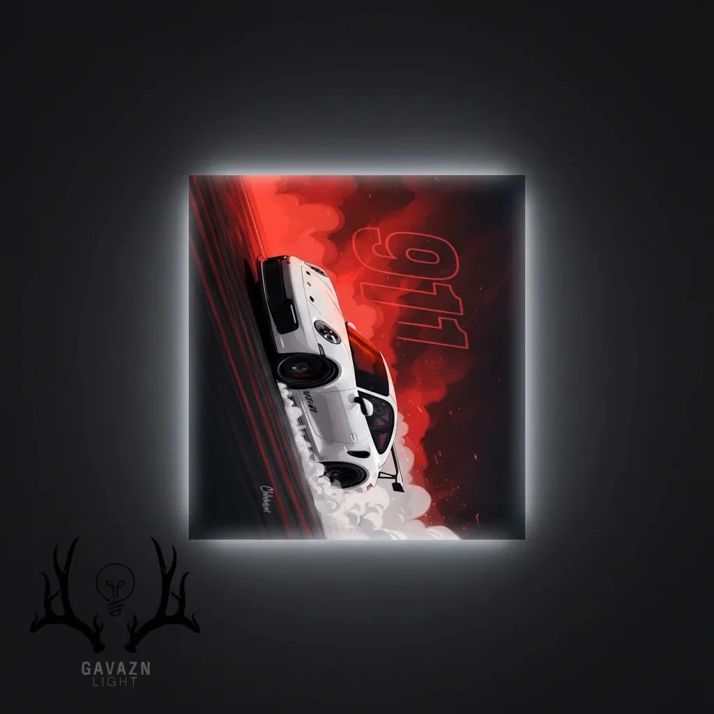 این تابلو بکلایت تصویری پویا از **Porsche 911** را در حال شتاب و دریفت به نمایش میگذارد؛ نمادی از ظرافت مهندسی و قدرت بیمهار در قالبی هنری. بدنه سفید خودرو در تضاد شدید با پسزمینهی تند قرمز و غلتان دود سفید دیده میشود و عدد بزرگ **911** در پشت صحنه، مانند انعکاس انفجار سرعت روی آسمان نشسته است. ضربهی دیداری رنگ قرمز با حرکت مورب خطوط آسفالت، حس رانش و شتاب ناگهانی را تداعی میکند. چاپ دقیق این اثر روی **تختهشاسی ۸ میلیمتری** انجام شده و نور سفید خنثی حاصل از **نوارهای ۱۲ ولت** از پشت تابلو، مرز روشن میان خودرو و فضای آتشین را در وضوحی نمادین نمایان میسازد. این ترکیب، هماهنگی میان پرخاش و نظم را در قالب یک تصویر درخشان به نمایش درمیآورد؛ جایی که هنر و مهندسی در خط قرمز تعادل با هم تلاقی میکنند.