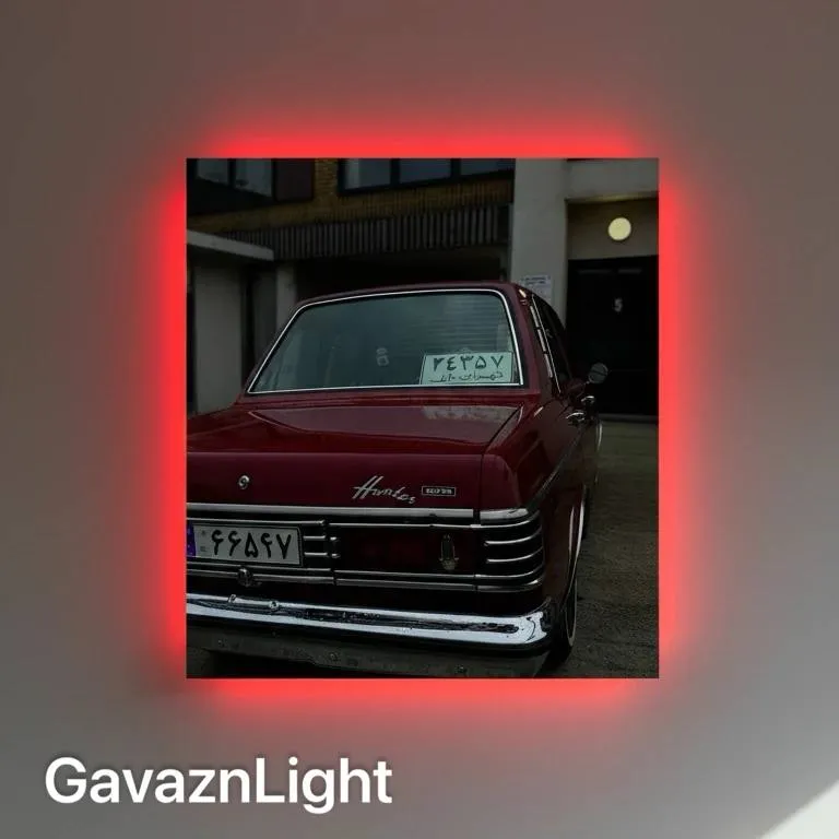 این تابلو بک‌لایت تصویری نوستالژیک و شهری از یک پیکان جوانان کلاسیک را نمایش می‌دهد؛ خودرویی با رنگ شرابی براق که در ترکیب با کروم صیقلی سپرها و خطوط بدنه جلوه‌ای کاملا وینتیج و اصیل پیدا کرده است. نور قرمز شدید که از پشت تابلو ساطع می‌شود دور تصویر هاله‌ای پرانرژی ایجاد کرده و حال‌وهوای خیابانی اثر را تقویت می‌کند، به‌گونه‌ای که ماشین در مرکز نوری سینمایی قرار گرفته و به یک نماد از خاطرات نسل‌های مختلف تبدیل شده است. انعکاس نور روی بدنه خودرو و تضاد میان تیرگی پس‌زمینه و درخشش کروم، حس عمق و برجستگی تصویر را افزایش می‌دهد و آن را شبیه یک فریم زنده از یک فیلم قدیمی ایرانی نشان می‌دهد. محیط آرام و سنگین اطراف، نماهای معماری ساده و فضای محوطه‌مانند باعث می‌شود تمرکز کاملا روی خودرو باقی بماند و شخصیت نوستالژیک آن برجسته‌تر دیده شود. این تابلو گزینه‌ای ایده‌آل برای دوستداران خودروهای کلاسیک، فضاهای مردانه، دکورهای صنعتی یا هر محیطی است که به دنبال اضافه‌کردن یک عنصر خاطره‌انگیز و تأثیرگذار باشد؛ ترکیبی از اصالت، جذابیت بصری و نورپردازی قدرتمند که نگاه را بی‌درنگ به خود جذب می‌کند.