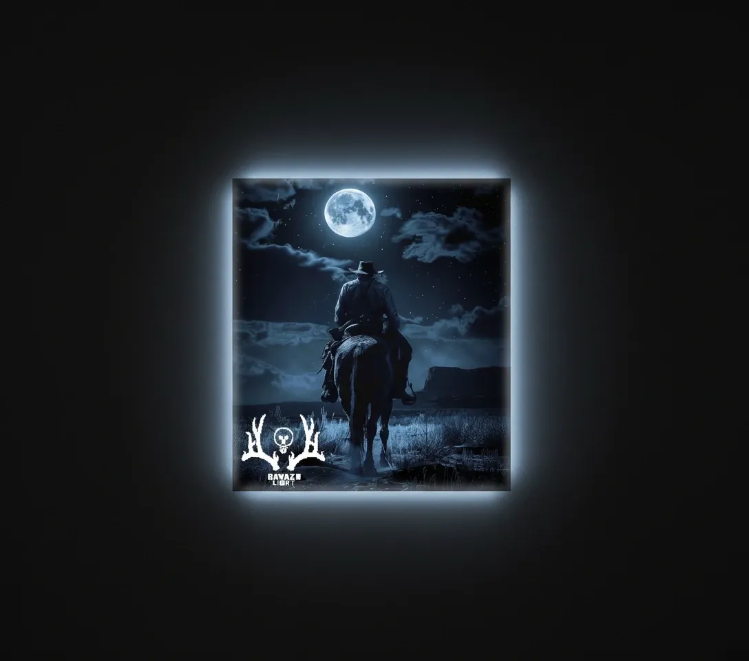 تابلو بک‌لایت **گوزن لایت – Cowboy Moonrise Silence** نمایی خیره‌کننده از **کابوی تنها زیر ماه کامل نقره‌ای** است؛ لحظه‌ای آرام در قلب شب کویری که سکوت دریاچه‌ی خشک و آسمان پرستاره را در خود حل کرده است. طیف رنگی اثر با تناسبی سرد و شاعرانه از **آبی مهتابی، نقره‌ی شب و خاکستری عمیق** ساخته شده تا روح تاریکی و آرامش را هم‌زمان منتقل کند. چاپ بر روی **تخته‌شاسی ۸ میلی‌متری** انجام شده و نور بک‌لایت از **نوارهای ۱۲ ولت طیف Ice Blue Light (آبی یخی مهتابی)** تأمین می‌شود. در فضاهایی با دیوار **خاکستری مات**، هاله‌ی نور سرد این تابلو حس نور ماه واقعی روی دیوار را بازآفرینی می‌کند.