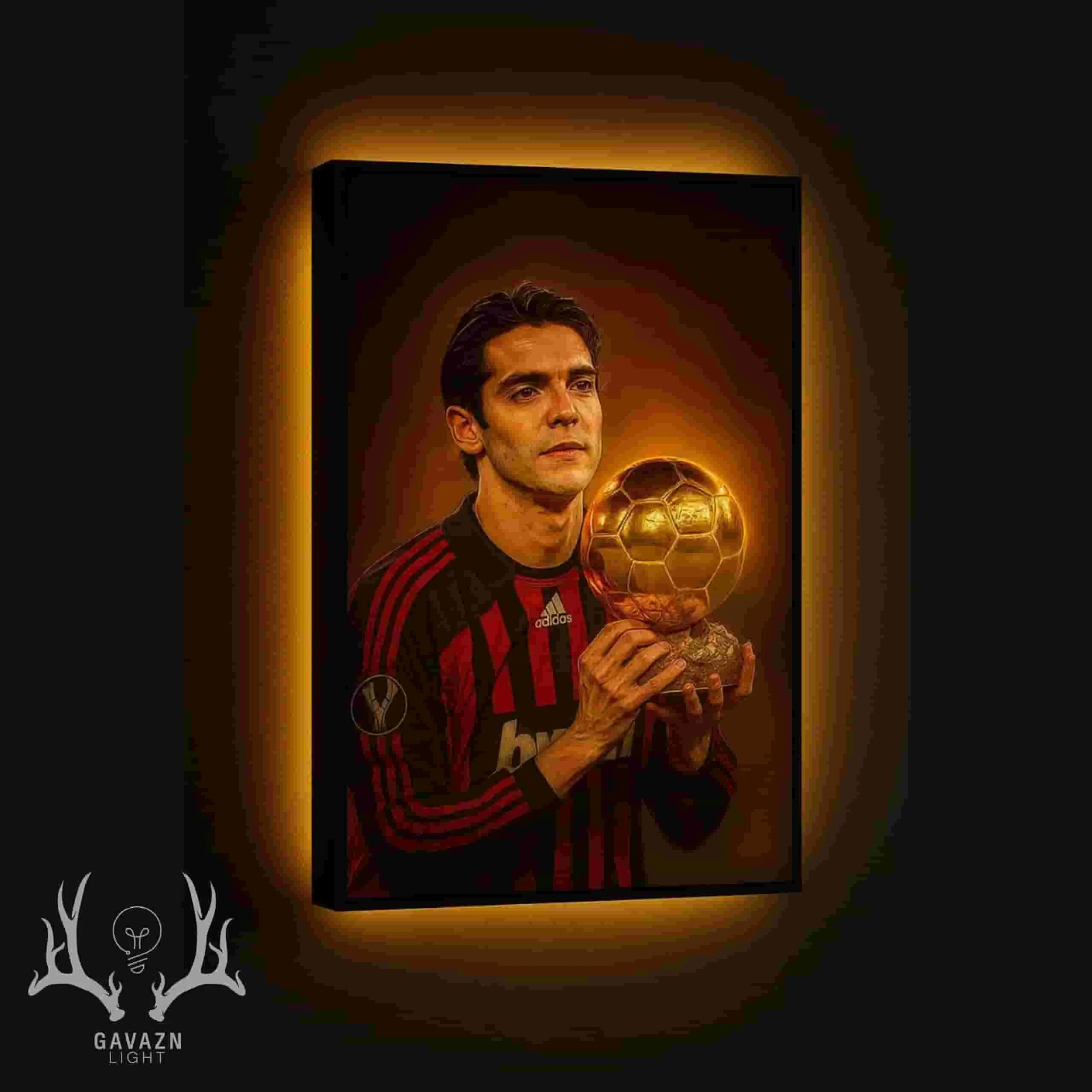 در این اثر، تصویر کاکا با لباس سنتی آ.ث. میلان در لحظه‌ای نمادین از افتخار به نمایش درآمده است؛ جایی که نور طلایی توپ، شکوه و ارزش واقعی فوتبال اصیل را بازتاب می‌دهد. اجرای این تابلو روی تخته‌شاسی هشت‌میلی‌متری و به کمک نوارهای نوری ۱۲ ولت با دمای رنگ حدود ۳۰۰۰ کلوین انجام شده تا گرما و درخشش طلایی صحنه به‌صورت طبیعی و هماهنگ در فضا پخش شود. نور از پشت به شکلی نرم و یکنواخت پراکنده شده و در تضاد با زمینه‌ی تیره، جلوه‌ای سینمایی و باشکوه خلق می‌کند. پوشش مات ضدانعکاس باعث وضوح و عمق بهتر رنگ‌ها شده و هاله‌ی نور گرم پشت تابلو حس شناوری و لطافت خاصی به آن بخشیده است. این مدل، نمایانگر ترکیب دقیق هنر نورپردازی و چاپ باکیفیت بالا است که در فضاهای لوکس یا کلکسیون‌های فوتبالی تأثیری چشمگیر به جا می‌گذارد.