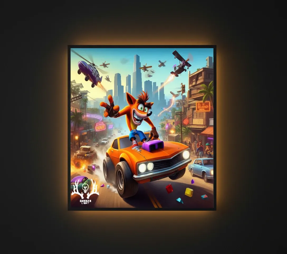این تابلو بکلایت با طرح **Crash Bandicoot – City Rush** انرژی و هیجان بازی کلاسیک را با فضایی مدرن و شهری ترکیب کرده است. تصویر، Crash را سوار بر ماشین نارنجی در خیابانهای پرتحرک نشان میدهد؛ هواپیماها و هلیکوپترها در آسمان، جعبههای شناور در مسیر، و فضای رنگی زندهی استوایی همگی حس انفجاری از سرعت، شوخطبعی و ماجراجویی را القا میکنند.