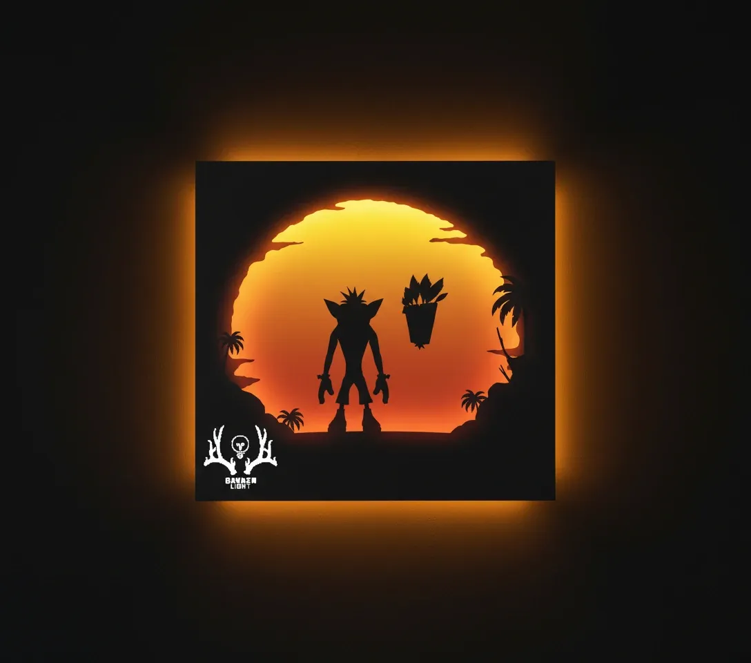 این تابلو بکلایت نمای خیرهکنندهای از سیلوئت **Crash Bandicoot** و **Aku Aku** را در مقابل غروب نارنجی–طلایی ساحل نشان میدهد. ترکیب رنگ گرم غروب با سایههای تیره حاشیهای، حس پایان ماجراجویی روز و آرامش طبیعت گرمسیری را القا میکند.