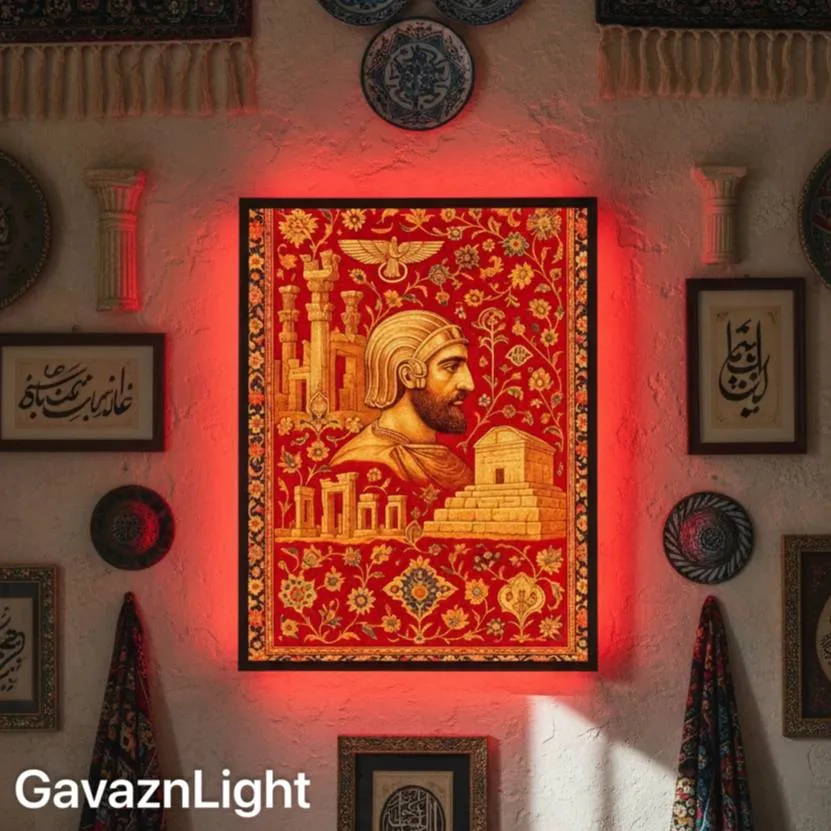 این اثر یک تابلو بکلایت با حالوهوای اصیل ایرانی است که بر زمینهای قرمز و پرجزییات شکل گرفته و عناصر تاریخی و نمادین را در ترکیبی یکپارچه و چشمگیر به نمایش میگذارد. نقشهای اسلیمی و گلوبوتههای سنتی تمام سطح پسزمینه را پوشاندهاند و با رنگ طلایی درخشان خود جلوهای شبیه قالیهای فاخر ایرانی ایجاد کردهاند. در بخش مرکزی چهرهای الهامگرفته از هنر هخامنشی در کنار ستونهای یادآور تختجمشید و نماد فروهر قرار گرفته و ارتباط میان هویت باستانی و میراث فرهنگی را تقویت میکند. در قسمت پایین نیز بنایی سنگی مشابه آرامگاههای کهن دیده میشود که ساختار ترکیب را کامل میکند. نور پسزمینه قرمز عمیق که دور تا دور تابلو پخش شده است به اثر حس گرما، قدرت و شکوه میدهد و باعث میشود رنگهای طلایی و طرحهای ماتریسی ایرانی با شدت بیشتری دیده شوند. این تابلو برای دکوراسیونهایی با محوریت هنر ایرانی، فضاهای فرهنگی یا خانههایی با روحیه سنتی انتخابی مناسب است و روی تخته شاسی بدون فریم جلوهای مدرن و در عین حال ریشهدار پیدا میکند.