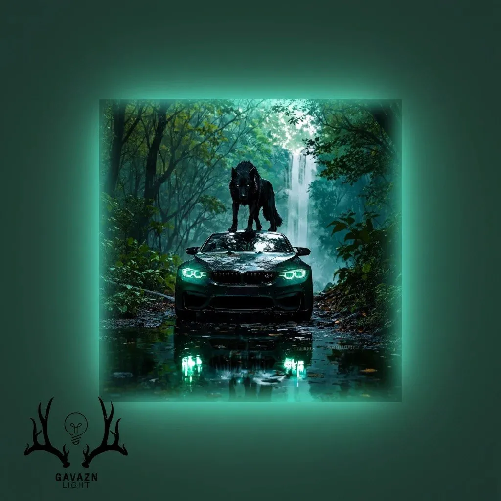این تابلو بک‌لایت تصویری از BMW M4 را در قلب جنگلی نمناک و خاموش نمایش می‌دهد؛ جایی که مه‌ در میان درختان می‌رقصد و صدای آبشار در پس‌زمینه، سکوتی مرموز به تصویر می‌بخشد. در میانه‌ی ترکیب، گرگی سیاه بر روی سقف خودرو ایستاده؛ نمادی از قدرت، هوشیاری و مالکیت بی‌چون‌وچرای قلمرو. نگاه درخشان آن با چراغ‌های سبز نئون خودرو هماهنگ است و فضایی ماورایی و در عین حال وحشی پدید آورده است. بازتاب نورها بر سطح خیس زمین و سایه‌ی نرم میان برگ‌ها، احساس زنده‌ی جنگل پس از باران را منتقل می‌کند. این اثر بر **تخته‌شاسی ۸ میلی‌متری** چاپ شده و توسط **نوارهای ۱۲ ولت** با نور سبز یخی احاطه شده است؛ نوری که مرز میان فناوری و طبیعت را از میان می‌برد و اثری خلق می‌کند که در عین آرامش، حس حرکت و سلطه‌ی بی‌صدا را در درون خود دارد.