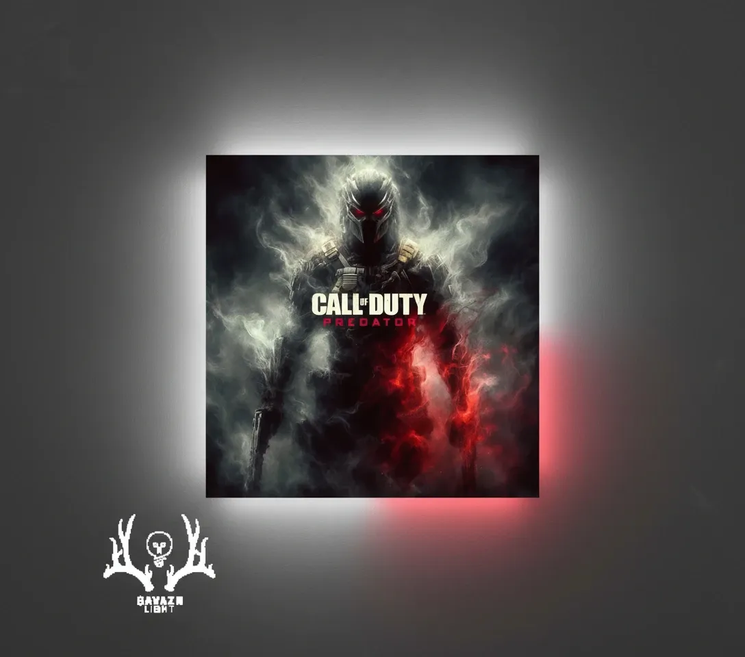 تابلو بکلایت **گوزن لایت – Call of Duty: Predator** تجسمی زیبا از جهان تاریک و تاکتیکال اکشن مدرن است؛ تصویری از **سرباز ناشناس با ماسک شکارچی** که در میان دود سفید و شعلههای قرمز پرهیبت ایستاده است. تضاد میان نور سفید سرد و حرارت آتش قرمز، دوگانگی «مرگ و قدرت» را در اثر نمایان میکند.