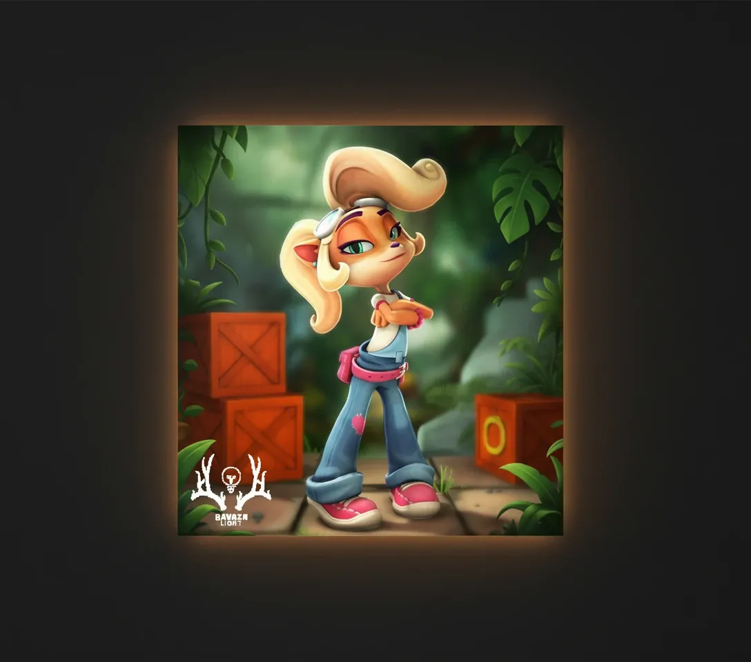 این تابلو بکلایت نمایی دلانگیز از فضای **Crash Bandicoot** را با شخصیت **Coco Bandicoot** در مرکز صحنه به تصویر میکشد. او با حالت اعتمادبهنفس در میان جعبههای چوبی و گیاهان استوایی ایستاده است و ترکیب رنگهای سبز، نارنجی و صورتی حال و هوایی سرزنده و فانتزی ایجاد کردهاست.