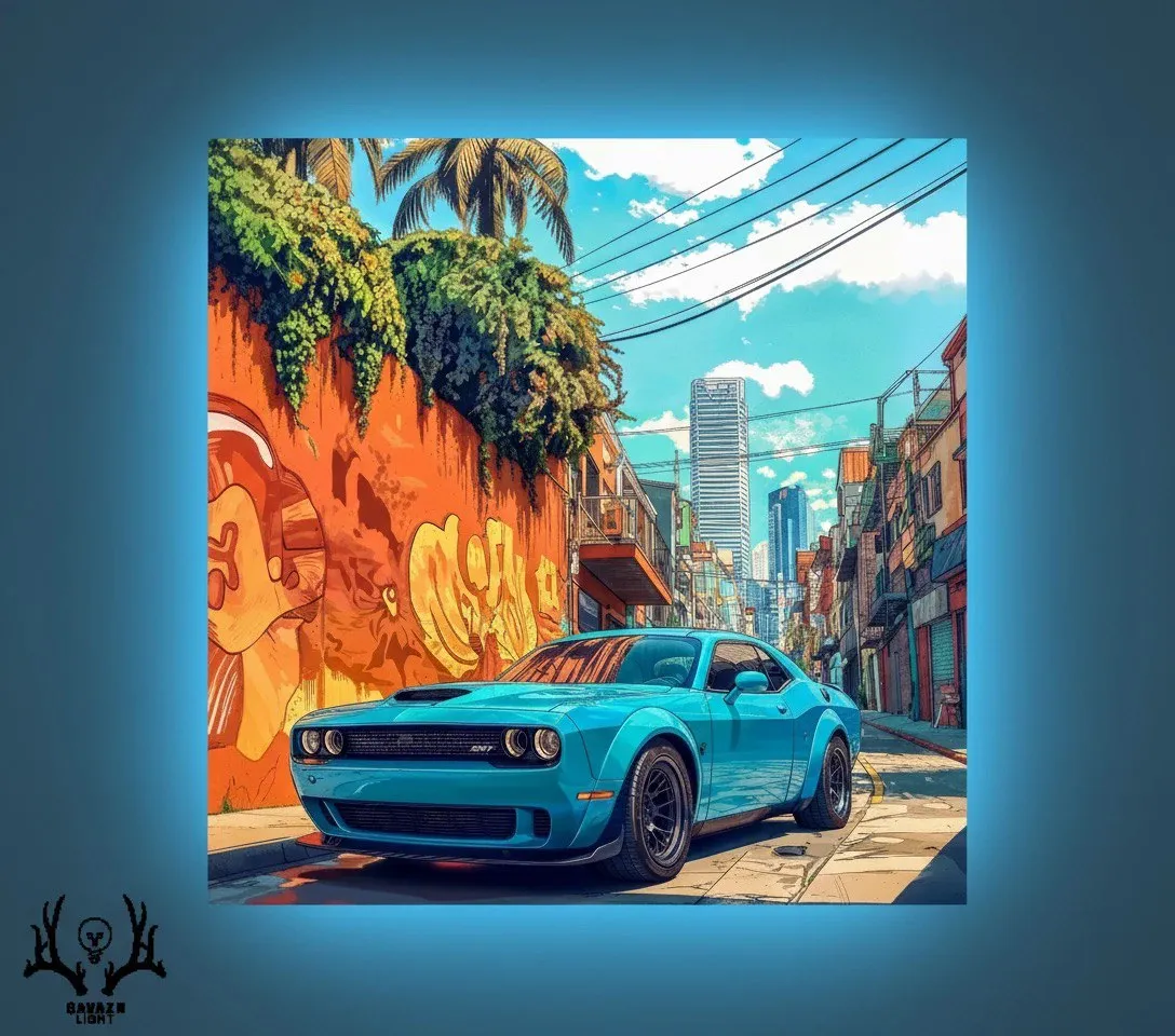 این تابلو بکلایت تصویری پویا از **Dodge Challenger آبی روشن** را در کوچههای شهری گرم و رنگارنگ نشان میدهد؛ خودرو با خطوط عضلانی و رینگهای مشکی مات در میان دیوارهای پوشیده از گرافیتی نارنجی و طلایی توقف کرده است. در پسزمینه برجهای بلند مدرن در کنار ساختمانهای کلاسیک، تضاد جالبی میان معماری معاصر و فضای خیابانی ایجاد کردهاند. نور خورشید از زاویه بالا بر سطح خودرو میتابد و بازتاب آن روی آسفالت خیس، درخشش فلزی و پرانرژی بدنه را تقویت کرده است. برگهای سبز گرمسیری و رنگهای زنده دیوار، روح جنبش شهری و سبک آمریکایی آزاد را تداعی میکنند. چاپ اثر بر روی **تختهشاسی ۸ میلیمتری** انجام شده و با **نوارهای ۱۲ ولت** مجهز به نور **آبی یخی** از پشت تابلو، حالتی نئونی و خنک ایجاد شده تا تضاد دلانگیزی با تن گرم گرافیتیهای اطراف شکل گیرد؛ تصویری از قدرت، آزادی و مفهوم رانندگی در قلب هنر خیابانی.