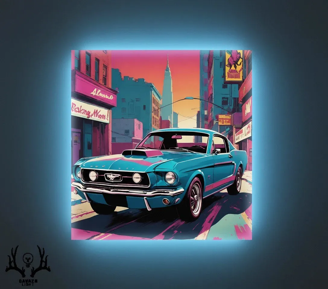 این تابلو بک‌لایت بازآفرینی هنرمندانه‌ای از **Ford Mustang کلاسیک دهه‌۶۰** را در فضای شهری غروب به تصویر می‌کشد؛ خودرو با رنگ فیروزه‌ای متالیک و خطوط نرم بدنه‌اش در مرکز خیابان‌های خالی شهر قرار گرفته و در پس‌زمینه، آسمان نارنجی گرم با ساختمان‌های صورتی و فیروزه‌ای تضادی چشم‌نواز ایجاد کرده است. تابلوهای تبلیغاتی و نورهای نئونی اطراف، حال‌و‌هوایی از نوستالژی آمریکایی را زنده می‌کنند و فرم سایه‌ها بر سطح خیابان حس حرکت را القا می‌نماید. انعکاس ملایم رنگ‌ها بر سپر کرومی و جلوپنجره‌ی موستانگ تصویری رؤیایی از دوران طلایی خودروهای عضلانی می‌سازد. این اثر روی **تخته‌شاسی ۸ میلی‌متری** چاپ شده و مجهز به **نوارهای ۱۲ ولت** با نور **آبی یخی** است که هاله‌ای سرد و دل‌نشین پیرامون تابلو ایجاد کرده و انرژی غروب نئونی را در فضا پراکنده می‌کند؛ ترکیبی از کلاسیک، قدرت و هنر شهری مدرن.