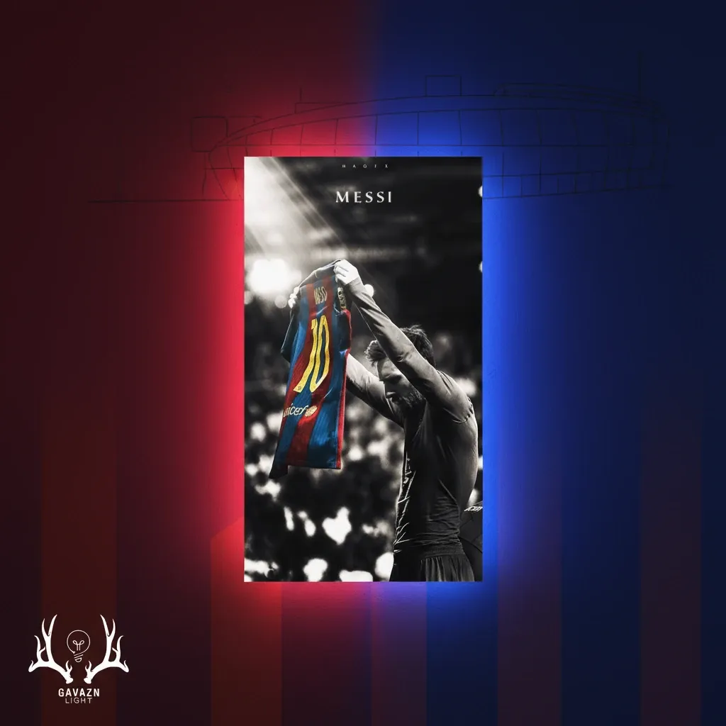 نورپردازی LED ترکیبی قرمز و آبی 12V از پشت تابلو، رگههایی از رنگهای نمادین بارسلونا را به پسزمینه میتاباند و حسی از شور و هیجان استادیوم را زنده میکند. این نور، جلوهای دراماتیک و عمیق به تابلو میبخشد و آن را به قلب تپندهی هر فضایی تبدیل میکند.