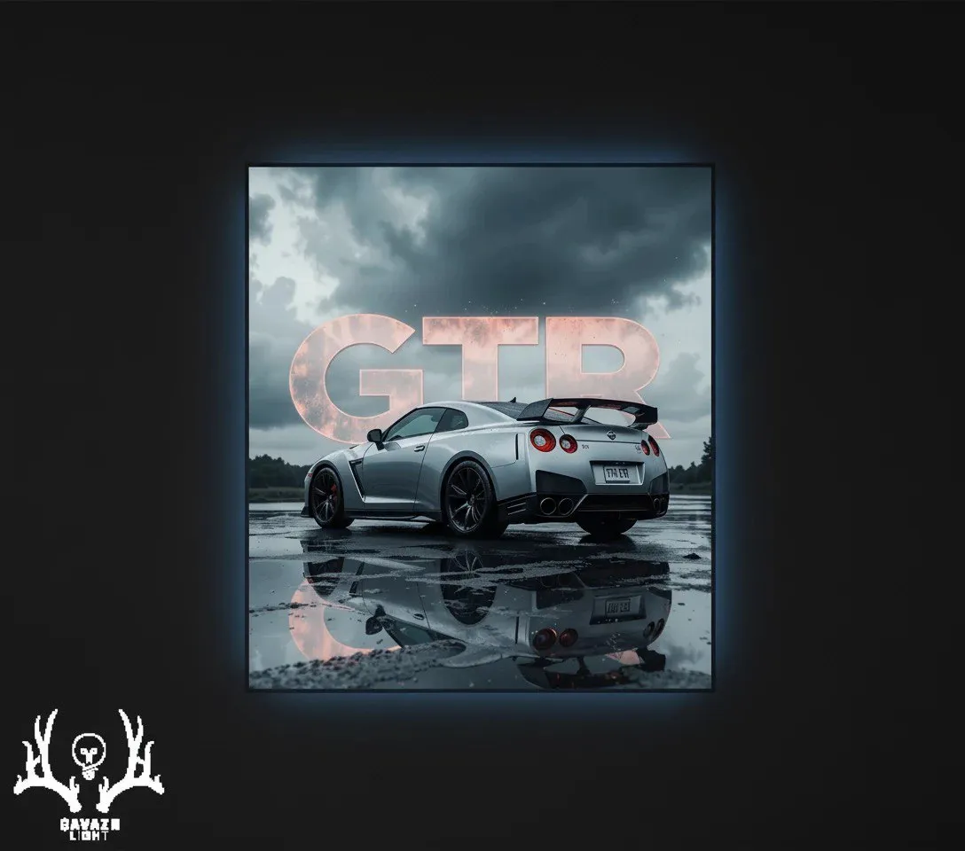 این تابلو بک‌لایت تصویری دقیق و مینیمال از **Nissan GT‑R** نقره‌ای را در فضایی بارانی و تیره به نمایش گذاشته است؛ نمای سه‌ربع از عقب خودرو روی سطح خیس آسفالت منعکس شده و ترکیب رنگ‌های سرد و خاکستری با رگه‌های صورتی از نور غروب، عمق و سکون اثر را به شکل سینمایی القا می‌کند. حجم صاف بدنه و باله بزرگ عقب در کنار تایپوگرافی محکم و ساده‌ی **GTR** که با افکت فلز سرد و درخشش کم‌رنگ طراحی شده، حس قدرت خام و تمرکز مطلق را القا می‌کند. چاپ اثر بر روی **تخته‌شاسی ۸ میلی‌متری** انجام شده و نور **آبی یخی** از **نوارهای ۱۲ ولت** به پشت تابلو تابیده می‌شود؛ این نور، بازتاب محیط بارانی را در سطح خیس تقویت کرده و تضاد زیبایی با آسمان تیره ایجاد می‌کند.
