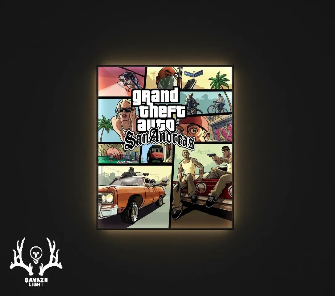این تابلو بک‌لایت نسخه‌ای هنری و کلاسیک از پوستر **Grand Theft Auto: San Andreas** را نمایش می‌دهد؛ طراحی کلاژ از فریم‌های شاخص بازی، با المان‌های خیابانی، موتورسواران، خودروهای کلاسیک دهه‌ی نود و حال‌و‌هوای گرم لس سانتوس. ترکیب رنگ‌های نارنجی، خاکی و سبز زیتونی در پس‌زمینه، حس تابستان غبارآلود و شور خیابانی را بازآفرینی کرده است. چاپ اثر بر روی **تخته‌شاسی ۸ میلی‌متری** انجام شده و نور **طلایی گرم** از **نوارهای ۱۲ ولت** در پشت تابلو پخش می‌شود. این نور با تون گرم طراحی هماهنگ بوده و جلوه‌ای نوستالژیک و سینمایی ایجاد می‌کند. این تابلو به‌ویژه در نور کم و بر دیوار **مشکی مات**، با درخشش ملایم خود یادآور روزهای کلاسیک San Andreas خواهد بود.