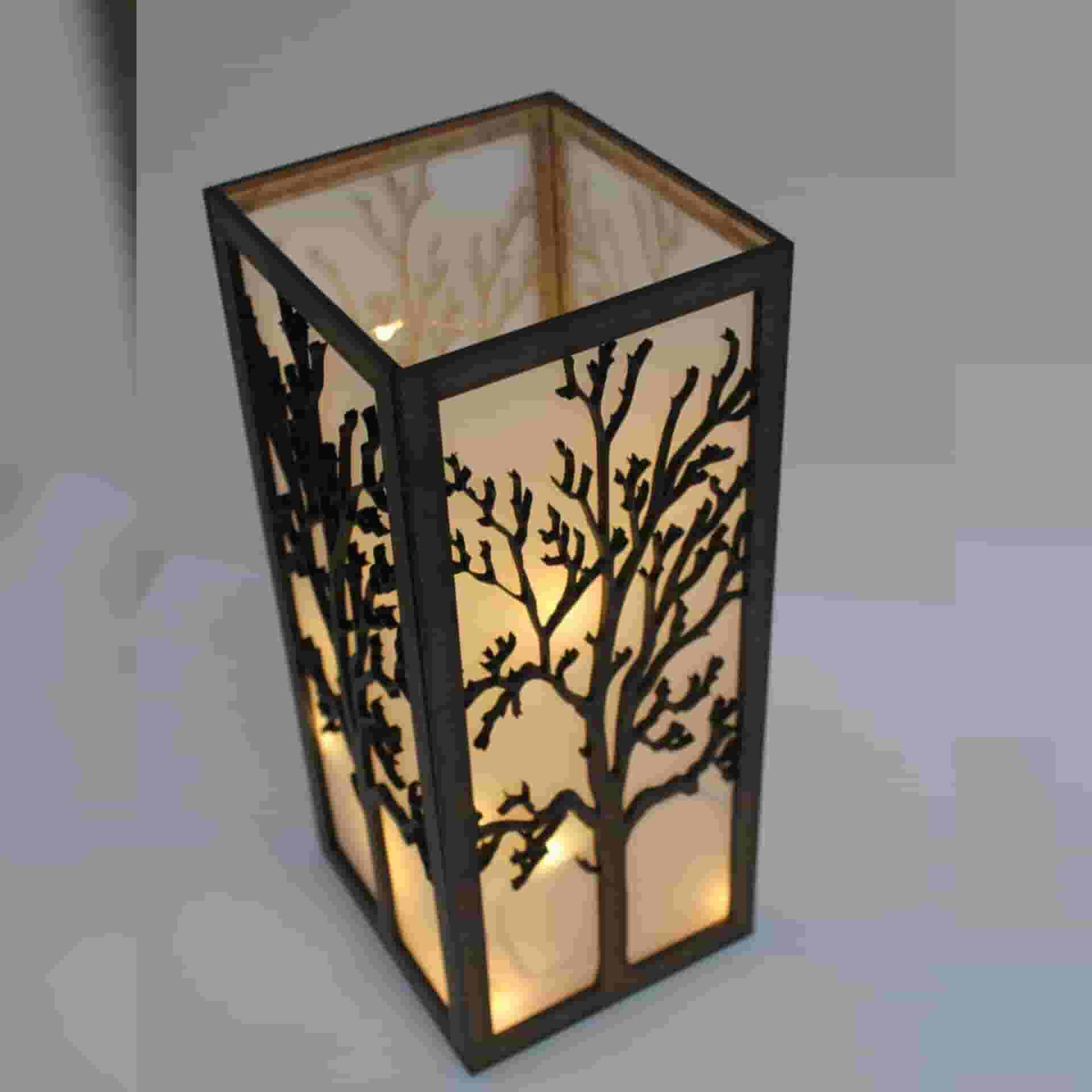 • نورپردازی دل‌نشین: عبور نور شمع از میان شاخه‌های طرح درخت، سایه‌ای هنری روی میز یا دیوار ایجاد می‌کند و محیطی آرام و رویایی می‌سازد.